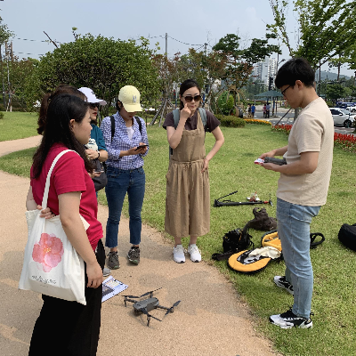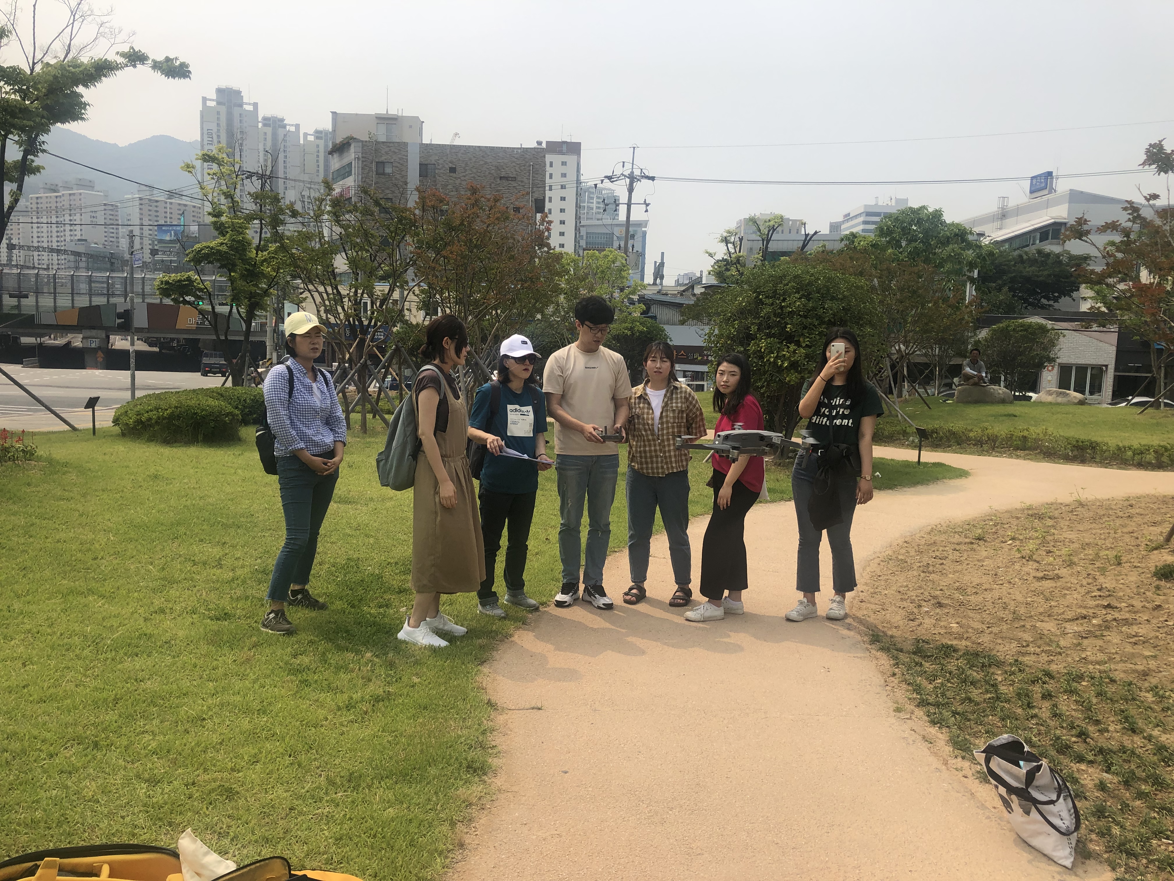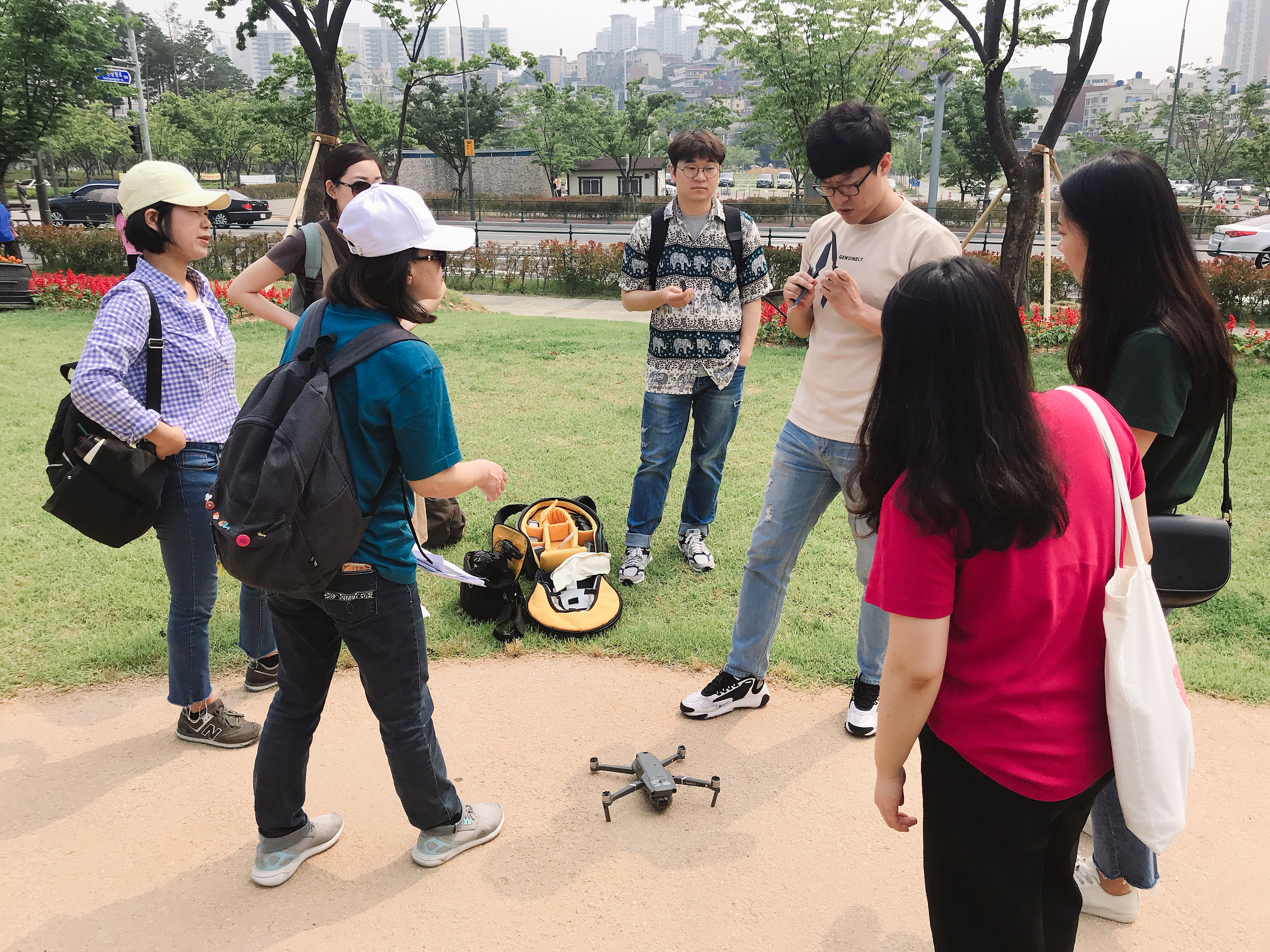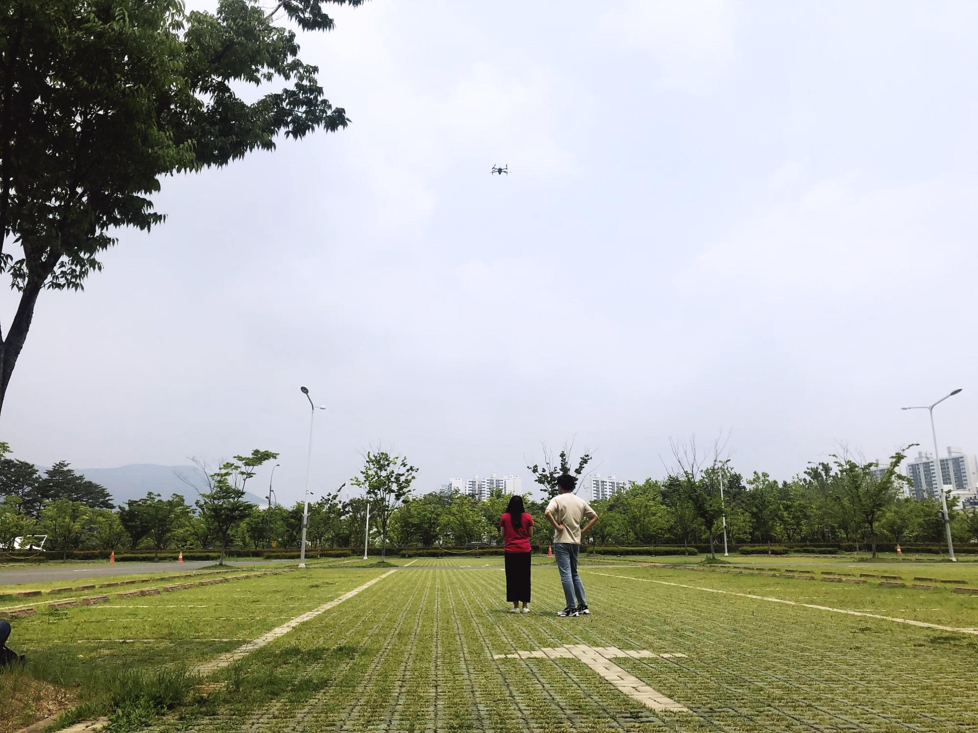 드론을 실습해 보기 위해 부산시민공원에 모였어요. 회사의 장비인 드론을 모두가 사용할 수 있도록 실시하는 직무교육 입니다. 그렇다고 전문가를 초청하는 고급(?) 교육은 아니었고요. 조금 더 아는 사람이 조금 더 모르는 사람에게 알려주는 소중한 시간이었습니다. 햇볕이 내려쬐는 날씨가 아니라 다행이었지만 후덥한 날씨가 사람의 진을 빼놓는 기분이었어요.