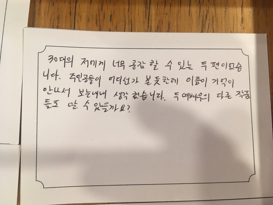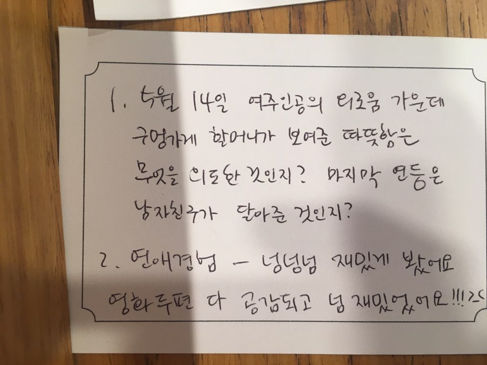 관객3 <5월14일> 할머니가 주신 약과로 위안받는 부분이 인상깊었다. <연애경험>에 시를 한번 더 읽는 부분이 좋았어요. 시가 한번 더 나왔는지 궁금하다.