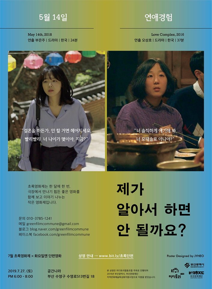 2019년 7월 초록영화제는 "제가 알아서 하면 안 될까요?"라는 타이틀로 영화 ‹5월 14일›(2018)과 ‹연애경험›(2016)을 상영했습니다.