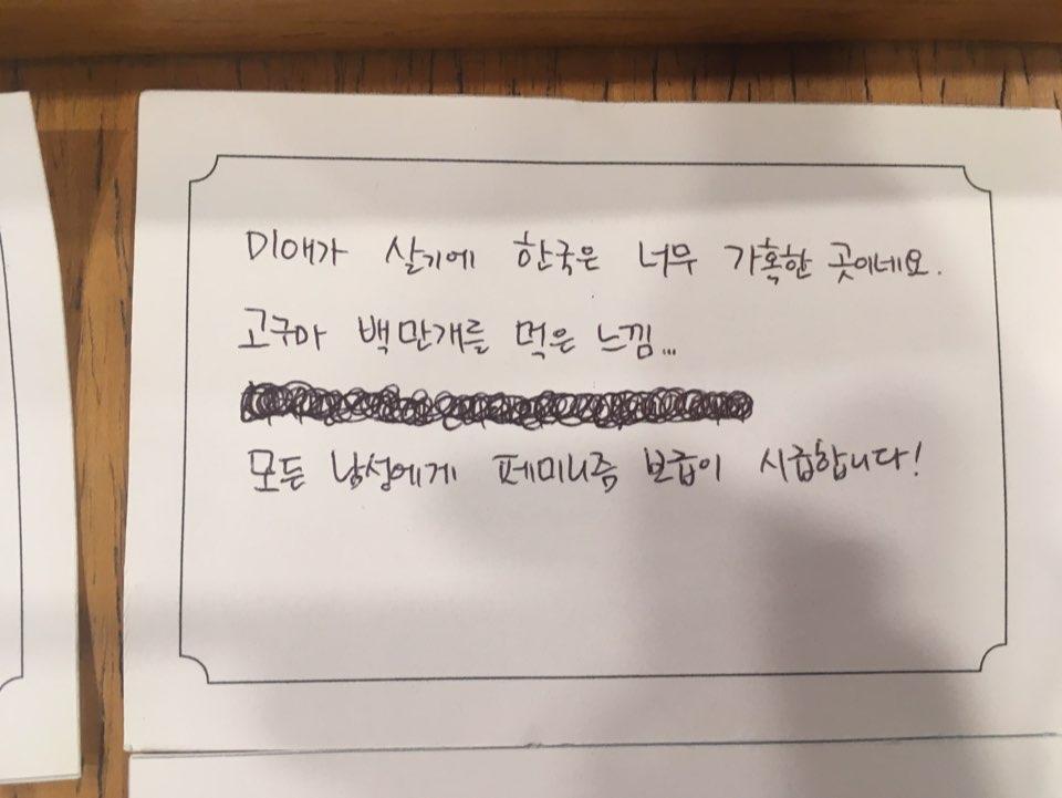 관객2 <연애경험> "연애경험있으세요" 라며 화내는 모습을 그림으로 그렸어요. 마지막에 갑자기 화를 내고 나한테 보태준 게 있냐고 하는 말에 너무 공감을 했다. 나도 알바를 할 때 팀장님한테 주인공처럼 괴롭힘과 간섭을 당했는데직접 사줄게 아니면 가만히 있으면 좋겠다