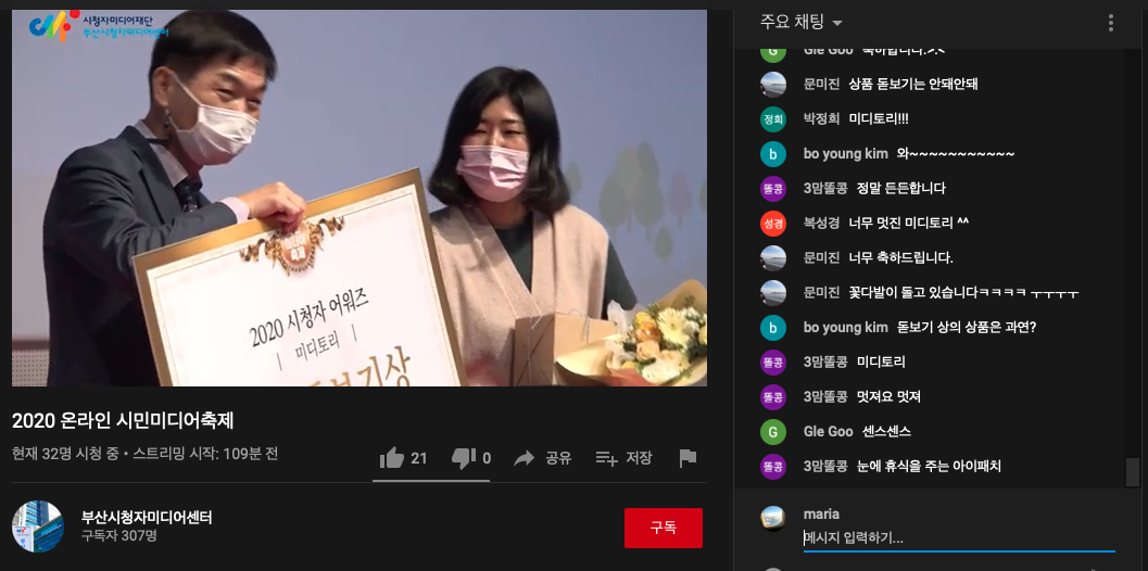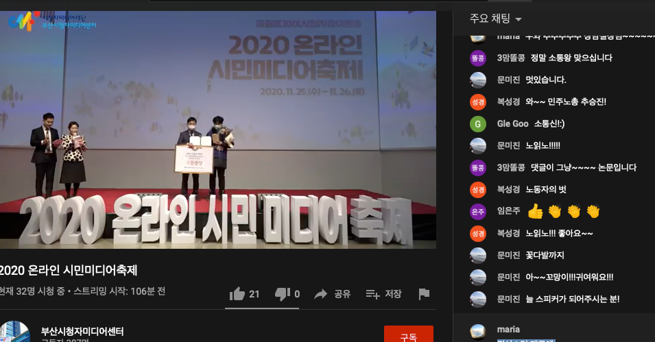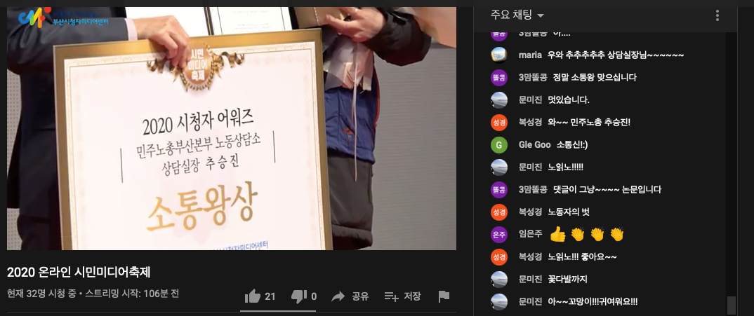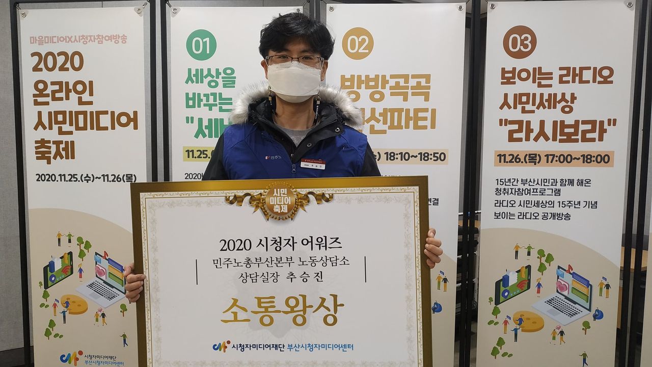 2020 온라인 시민미디어축제 '2020 시청자 어워즈'에서 시청자참여프로그램 <부산탐구생활>과 <노동법읽어주는노동자>코너의 추승진 상담실장(민주노총 부산본부 노동상담소)님이 각각 '부산돋보기상'과 '소통왕'상을 수상하였습니다!