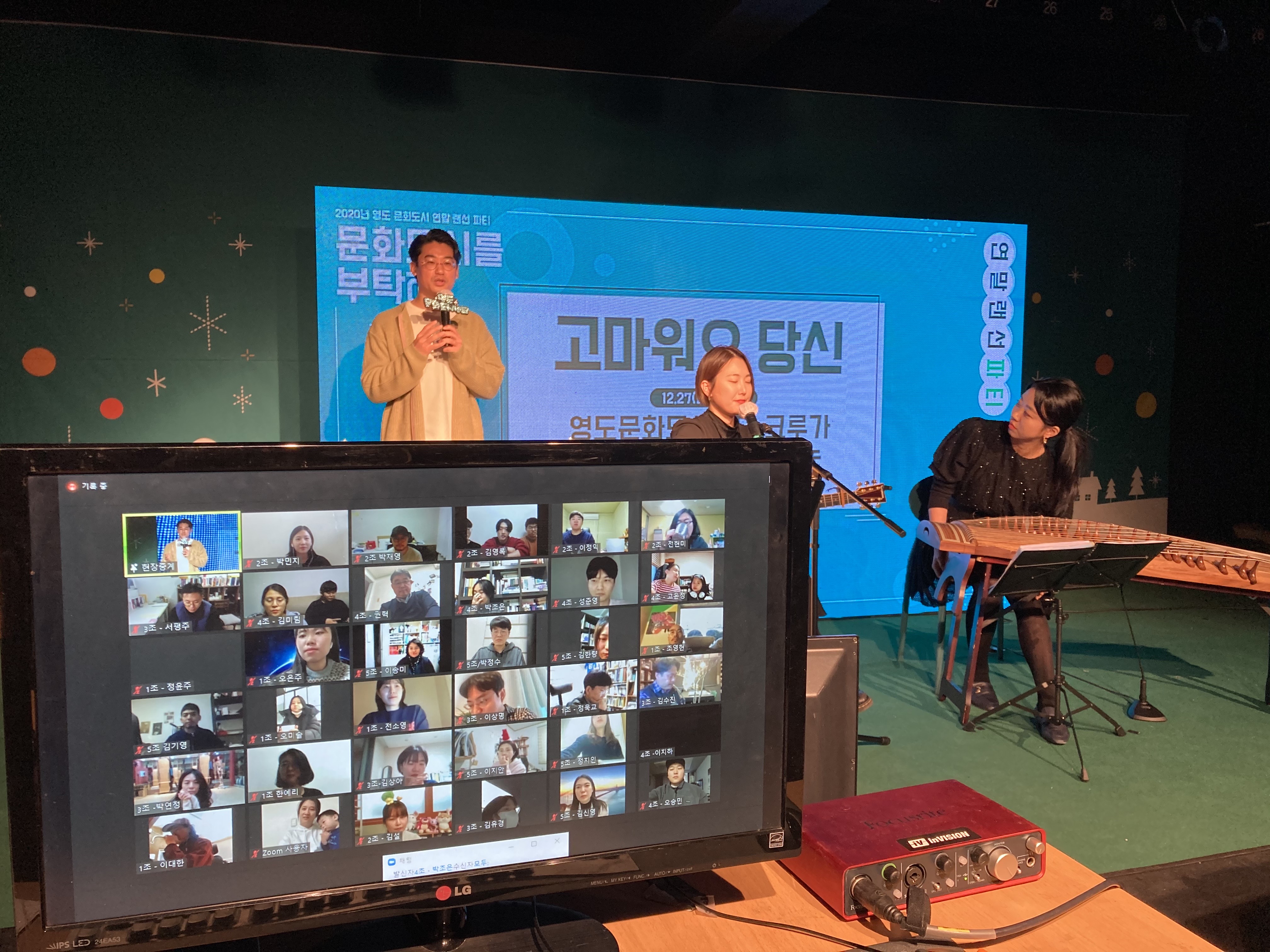 ■ 사업내용: 영도문화도시센터는 사업 참여자들과 네트워크를 내실화하기 위해 zoom를 기반으로 온라인 파티룸을 기획했습니다. 미디토리는 LED가 설치되어 있는 현장 무대를 유튜브와 줌 동시 중계하였습니다.
