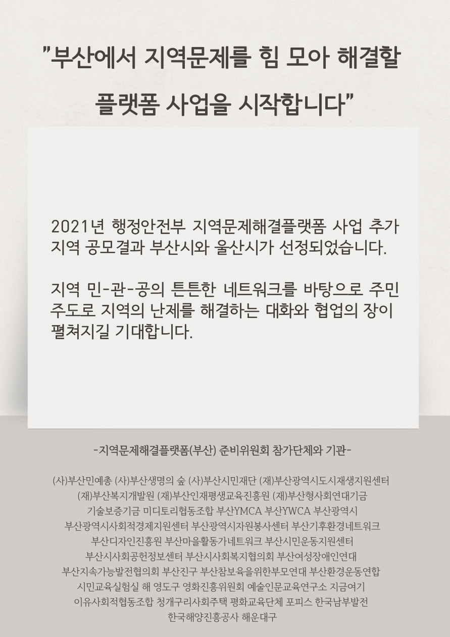 2021년 행정안전부 지역문제해결플랫폼 사업에 부산시가 선정되었다는 반가운 소식도 전합니다.