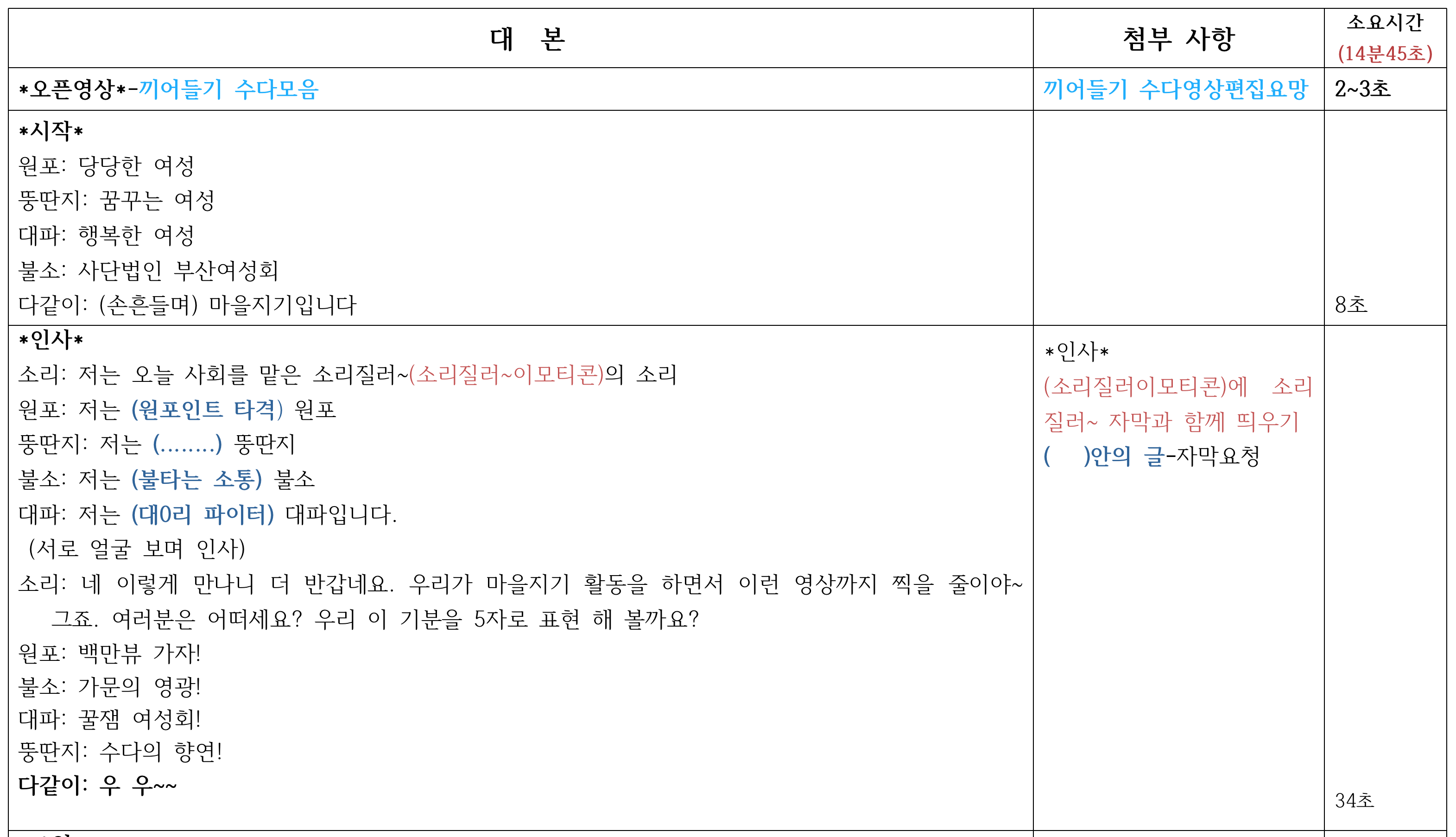 저는 가이드와 내용순서를 작성해서 보내고 다시 대본 수정은 여성회 회원분들이 거쳐 시나리오가 완성됐습니다.