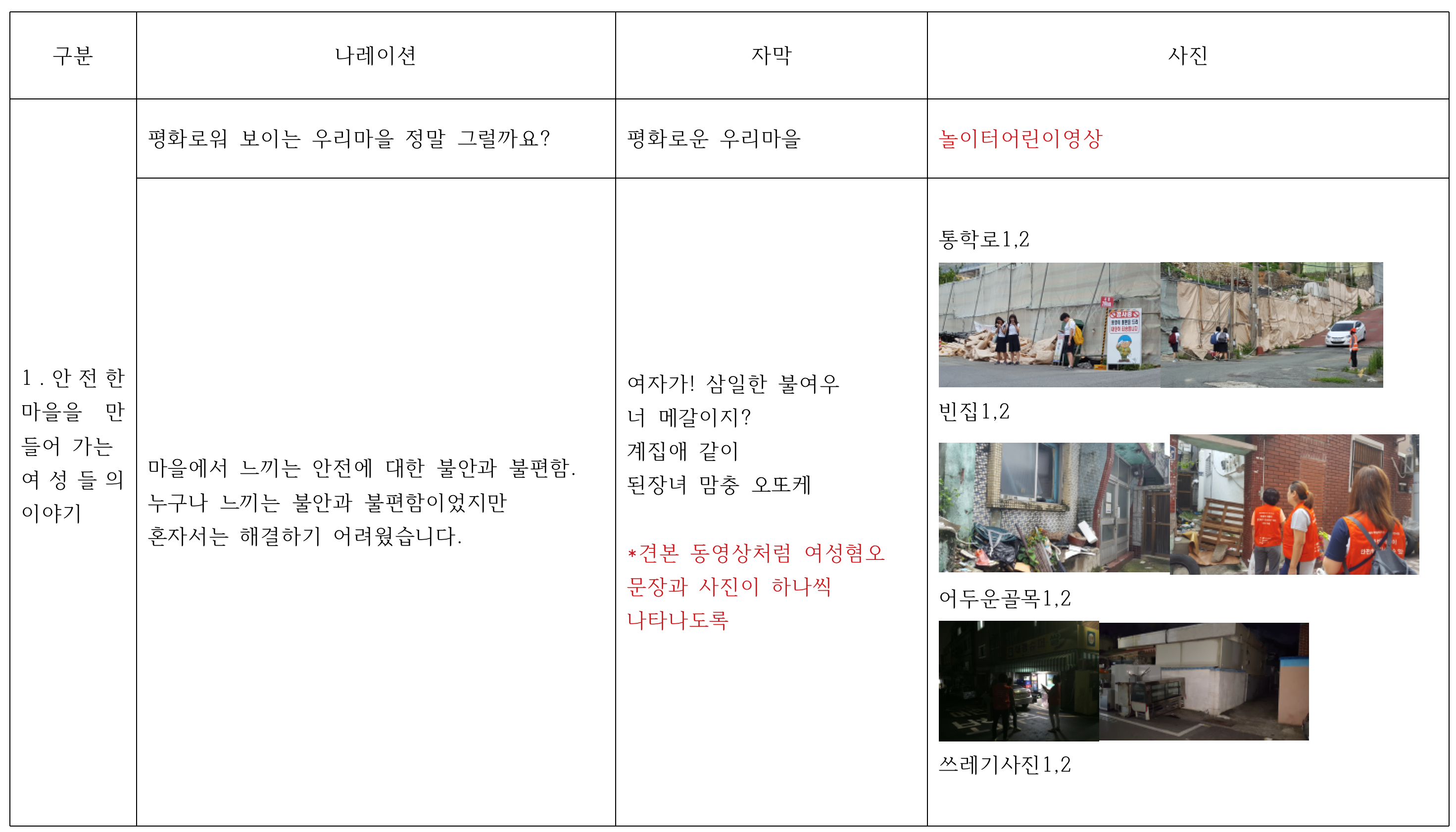 1조는 평범해 보이는 마을 곳곳에 숨어있는 여성 혐오가 얼마나 많은지 조사하고 민원까지 재기해서 바꿔나간 여성회의 마을안전지킴이 활동을 잘 부각할 수 있는 영상으로 제작하기로 했습니다. 1차 기획회의를 토대로 스토리보드를 작성하여 보냈고, 생각나는 이미지를 추가로 받았는데 막상 저작권이 문제가 되는 이미지들이 많았습니다.