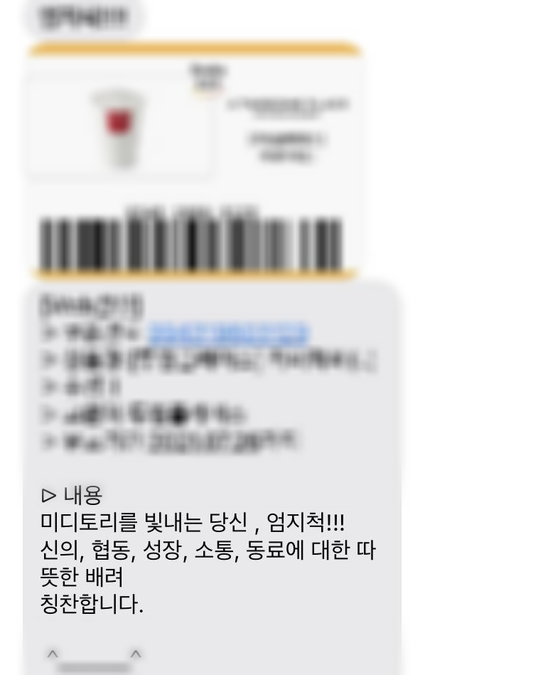 동료를 칭찬하고 싶은 순간이나 하나의 프로젝트를 마무리하고 나서 기억하고 싶은 뭔가가 있는데 다 전달할 수 없다면 간단하게라도 설문지에 떰즈 업을 보낼 수 있는데요. 떰즈 업을 받은 당사자에게는 매달 한 번 시상식을 통해 음료 쿠폰을 증정하고 있습니다.