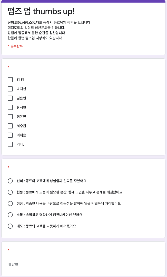 떰즈 업! 하나로 조직이, 기업이 한 순간에 바뀌긴 힘들겠지요. 하지만 칭찬하고 싶은 순간을 놓치지 않고 서로에게 힘이 되는 문화를 만들어 가고 싶습니다. 미디토리는 아직도 ing~🥰 오늘도 칭찬해~ 👍👏🙌