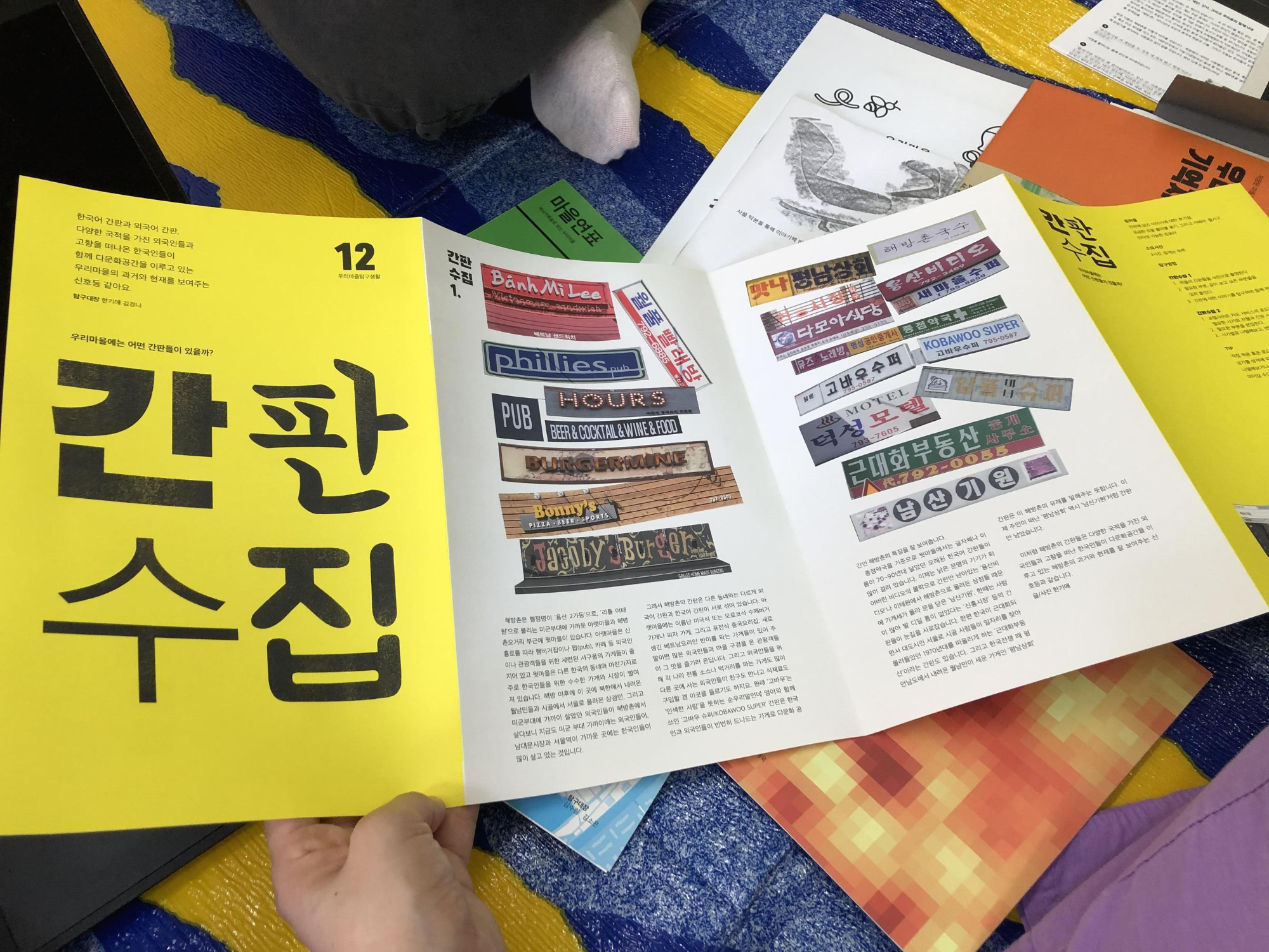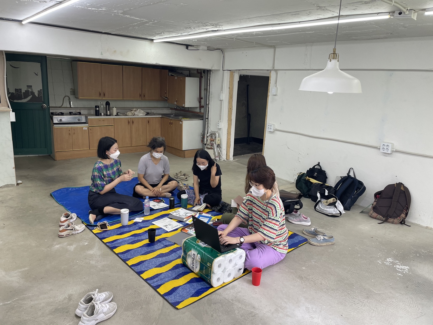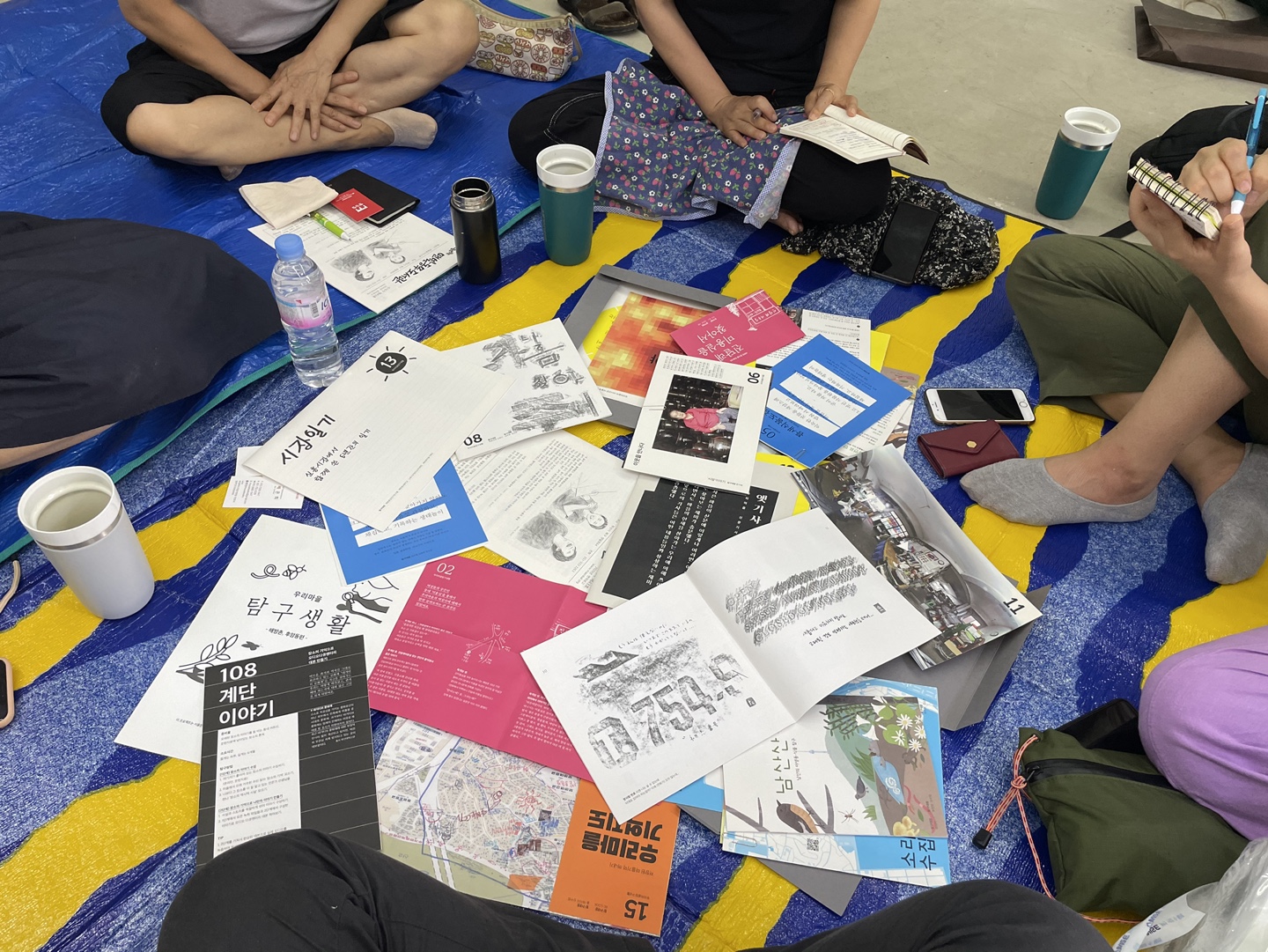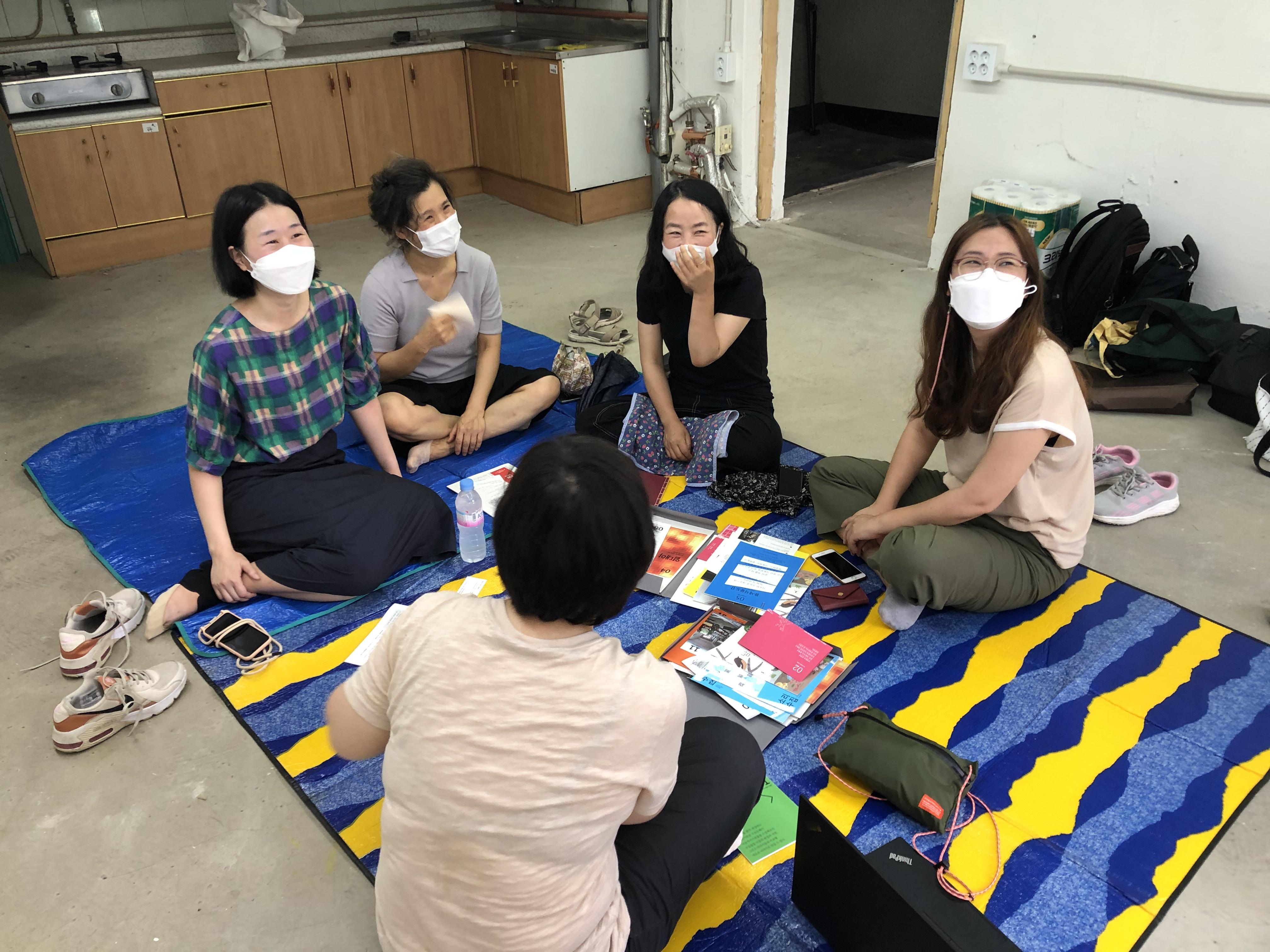 드디어 해방촌에 도착! 마을기록단 디자이너로 활동하신 선생님과 기획단으로 활동하신 주민분과 함께 했는데요. 이곳은 디자이너분이 새롭게 얻은 작업실인데 이사가 마무리되지 않아 바닥에 돗자리를 깔고 둘러앉아 이야기 나눴답니다. 덕분에 더 정감있고 편안한 이야기가 오고 갔습니다.