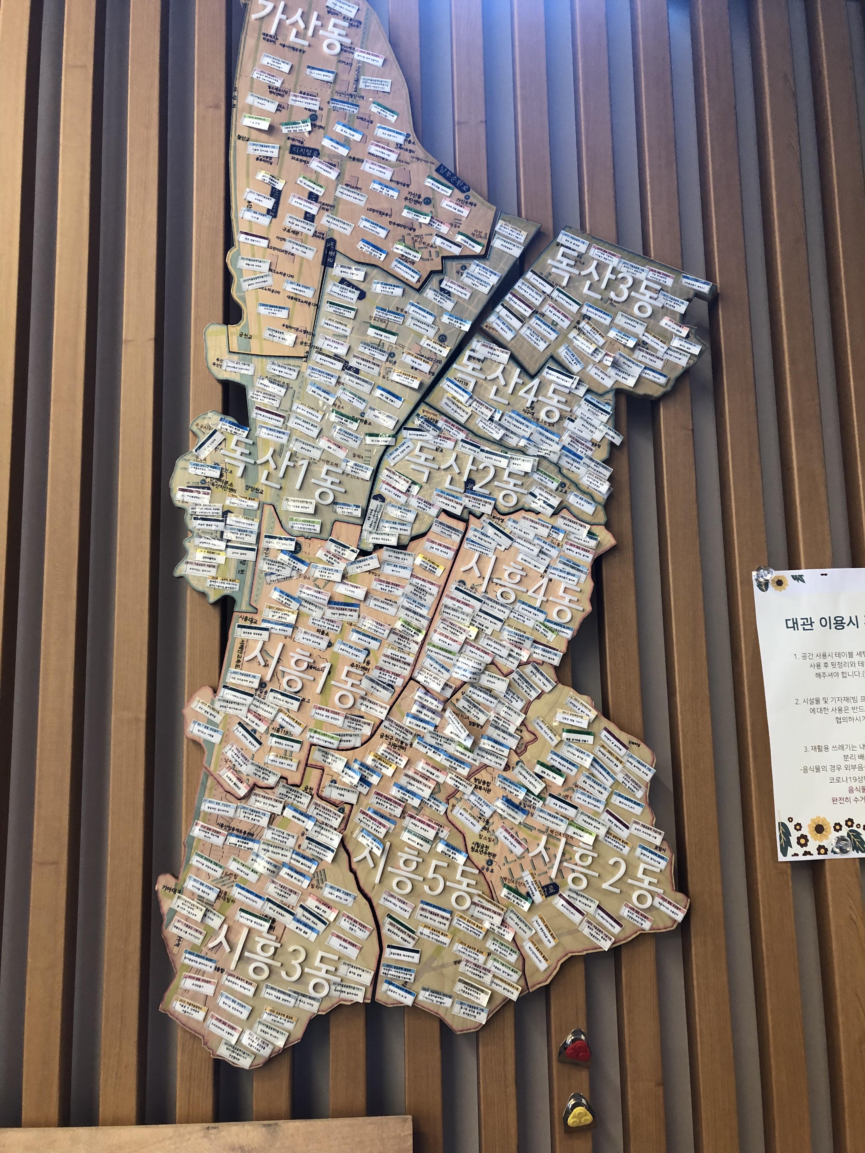 센터의 가장 큰 벽면에는 금천구 마을지도가 있어 한눈에 공동체들이 어떤 활동을 하고 있는지 클리핑해놓으셨더라고요. 생동감이 느껴졌습니다. 공간 곳곳에는 이용하는 주민들과 함께 지켜야할 활동수칙, 성평등마을을 만들기 위한 약속문이 부착되어있습니다. 서로의 삶의 방식을 존중하면서, 성별과 세대로 인한 차별을 지양하는 문화를 만들기위해 노력하고 있네요. 금천구마을공동체기록관 PM 엄샛별님으로부터 거버넌스 협치가 어떻게 이루어지고 있는지, 주민들의 기록활동을 어떻게 지원하고 있는지 자세한 설명을 듣고 있습니다. 마지막 코스여서 그런지 내용과 상관없이 구성원 모두 눈꺼풀이 무거워지고 있음이 느껴졌습니다. 질문을 하고 있지만 무슨 질문을 하고 있는지 생각이 안나는 사태에 이르렀지요. 다행히 사진에서는 드러나지 않았습니다. 휴~ 금천구마을공동체기록관의 엄샛별PM님은 기록관 업무 외에도 미디어활동가로서의 정체성을 베이스로 가지고 계셨어요. 마을청년들과 함께 더 재미난 일을 꾸려보기 위한 구상도 하고 계셨구요. 무엇보다 주민의 언어를 행정의 언어로 바꾸어 전달하고 행정의 요구를 주민이 수용할 수 있는 방향으로 대안을 제시하는 탁월한 커뮤니케이션 능력을 가지신 분이었어요! 시스템도 중요하지만 열린 마인드의 행정과 활동가 개개인의 노력도 중요하다는 걸 깨달았답니다!