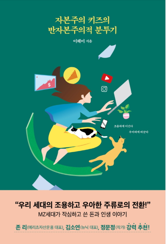 김영 요즘 아이들이라고 불리는 MZ 세대가 어떠한 생활방식으로 사회의 부조리함 맞서 살아가는지 MZ세대 당사자가 직접 알려주는 책입니다. 작은 실천이 일상을 단단하게 지키는 것이 중요하다고 생각하는 저자는 미라클 모닝을 하고 있는데, 이것은 박정희식 근면성실과는 분명히 선을 긋습니다. 기존 질서가 요구하는 평범성과 정상성을 끼워 맞추는 것이 아니라 주변에 휘둘리지 않고 삶의 주체성을 회복하고 나로 존재하기 위해서 갖는 시간으로 바라보고 있어요. 나의 일상성, 주체를 지키기 위한 것이 반자본주의적이라고 표현되는 것 같습니다.