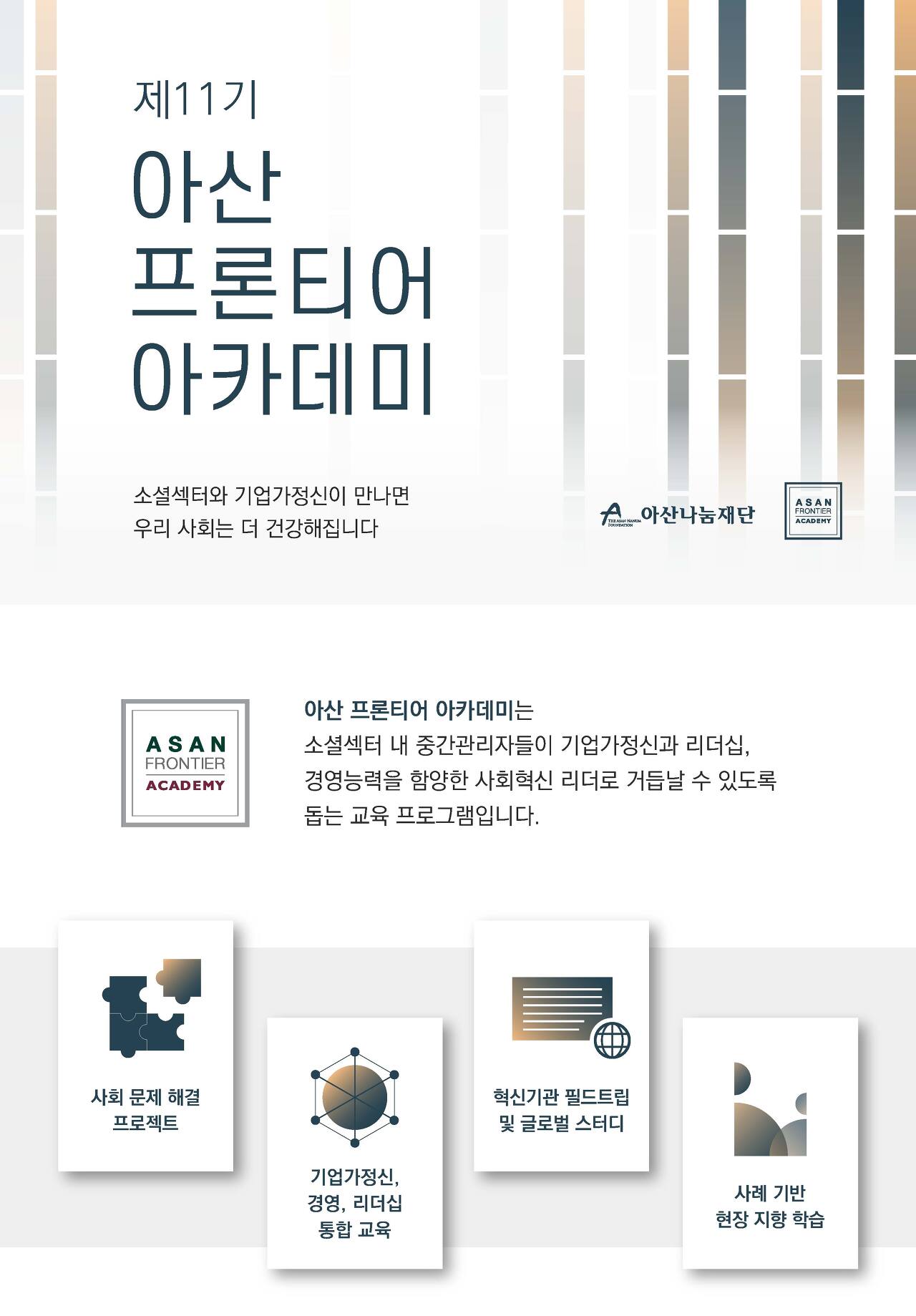 아산나눔재단에서는 2013년부터 '국내 소셜섹터의 미래를 이끌어 갈 차세대 사회혁신 리더 양성'을 목적으로 소셜섹터 내 중간관리자들을 대상으로 "아산 프론티어 아카데미"를 운영하고 있는데요.