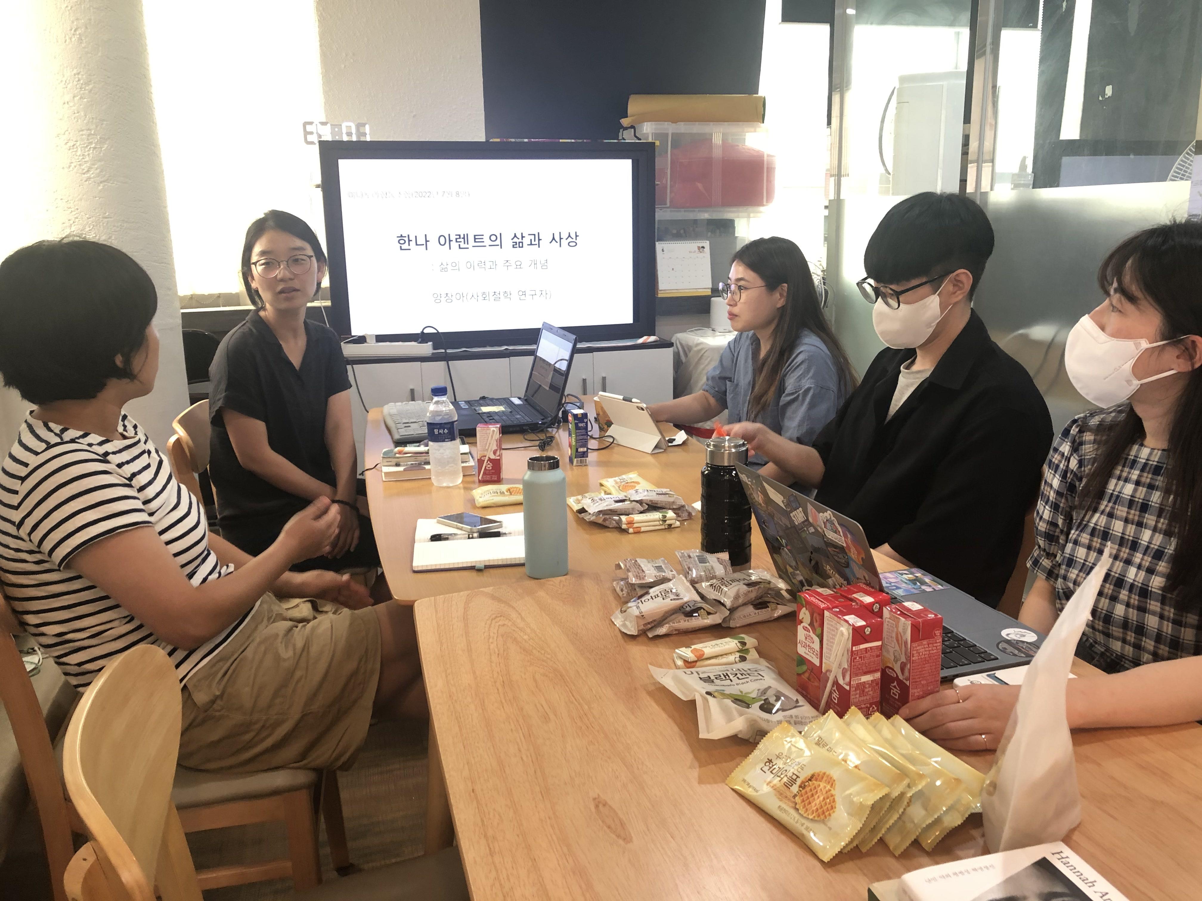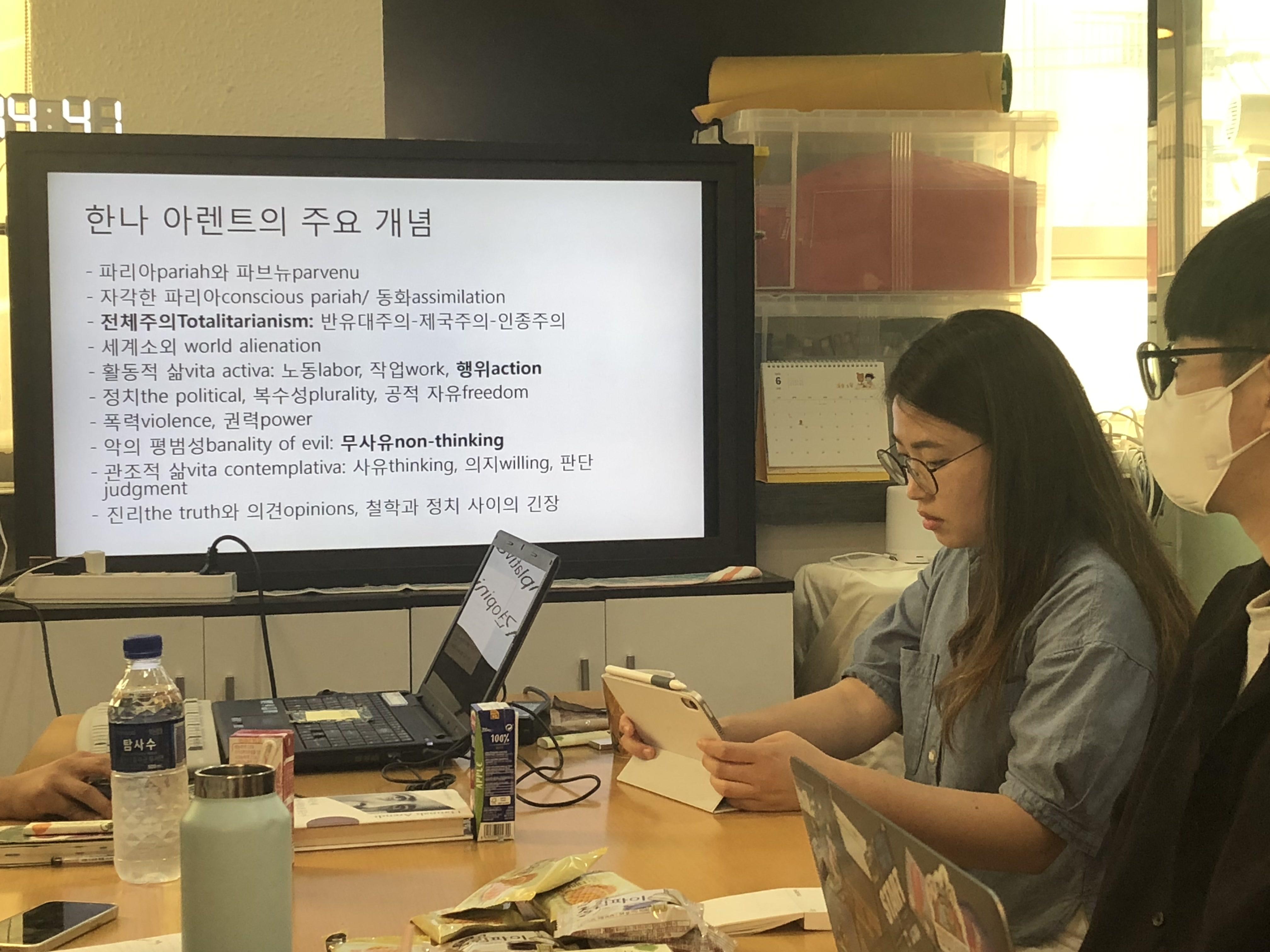 제 개인적인 삶의 모습도 어쩌면 고독하게 사는 삶을 추구하는 경향이 있는 것 같은데, 저한테 편한 삶의 방식이 고립이나 외로움으로 진전되는 환경에 처하면 위험할 수 있겠구나하는 생각이 들었어요. 하지만 (한나 아렌트가 강조했던) '우정'을 나눌 수 있는 동료들이 이곳 미디토리에 있어요. 여기 있는 사람들은 개성 강하고 다양한 취향을 가졌지만 한 테이블에 둘러 앉아 이야기 나눌 수 있는 사람들이니까요.
