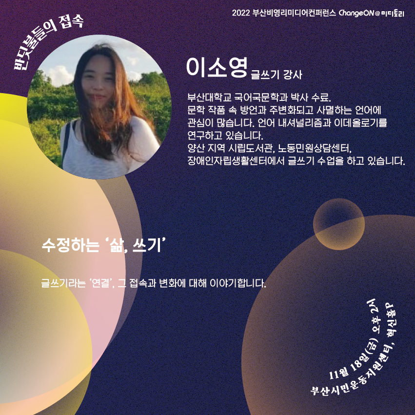연사 이수경, 김설해, 배성민, 이소영, 김나은, 이상석, 서홍석 협력 전구슬(부산시민운동지원센터) 후원 이수경(다음세대재단)