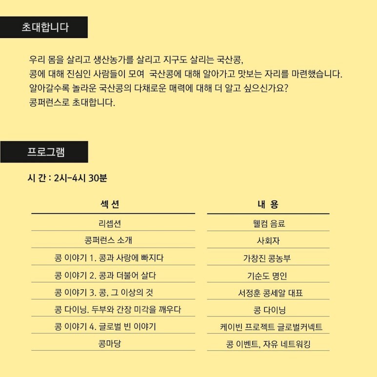 KBEAN조는 국산콩과 관련된 사람들을 만나서 소식을 전하고, '콩퍼런스'를 통해 국산콩에 진심인 모두를 잇는 시간을 가졌는대요. 발표하시는 분들을 만나뵈러 강화도로 담양으로 괴산으로 사전 만남을 하러 갔었구요. 우리 팀원이 직접 디자인하고 한땀한땀 준비한 컨퍼런스였답니다.