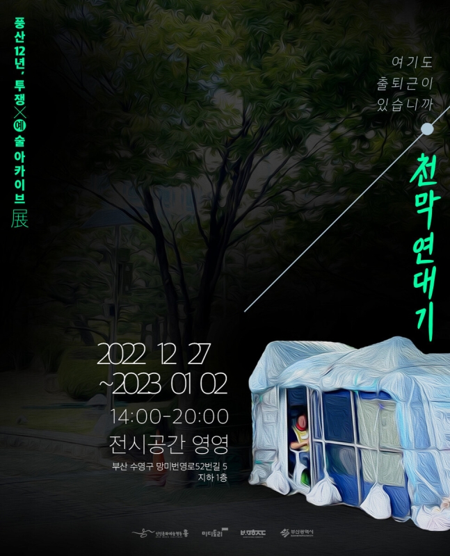 예술로 사회적 불평등 해소를 위한 행동을 만들어내는 ‘신진문화예술행동 흥’은 28일 “부산 수영구 ‘영영’에서 피에스엠씨 노동자 투쟁 과정 등을 담은 아카이브 전시 ‘천막 연대기’를 다음달 2일까지 연다”고 밝혔다.