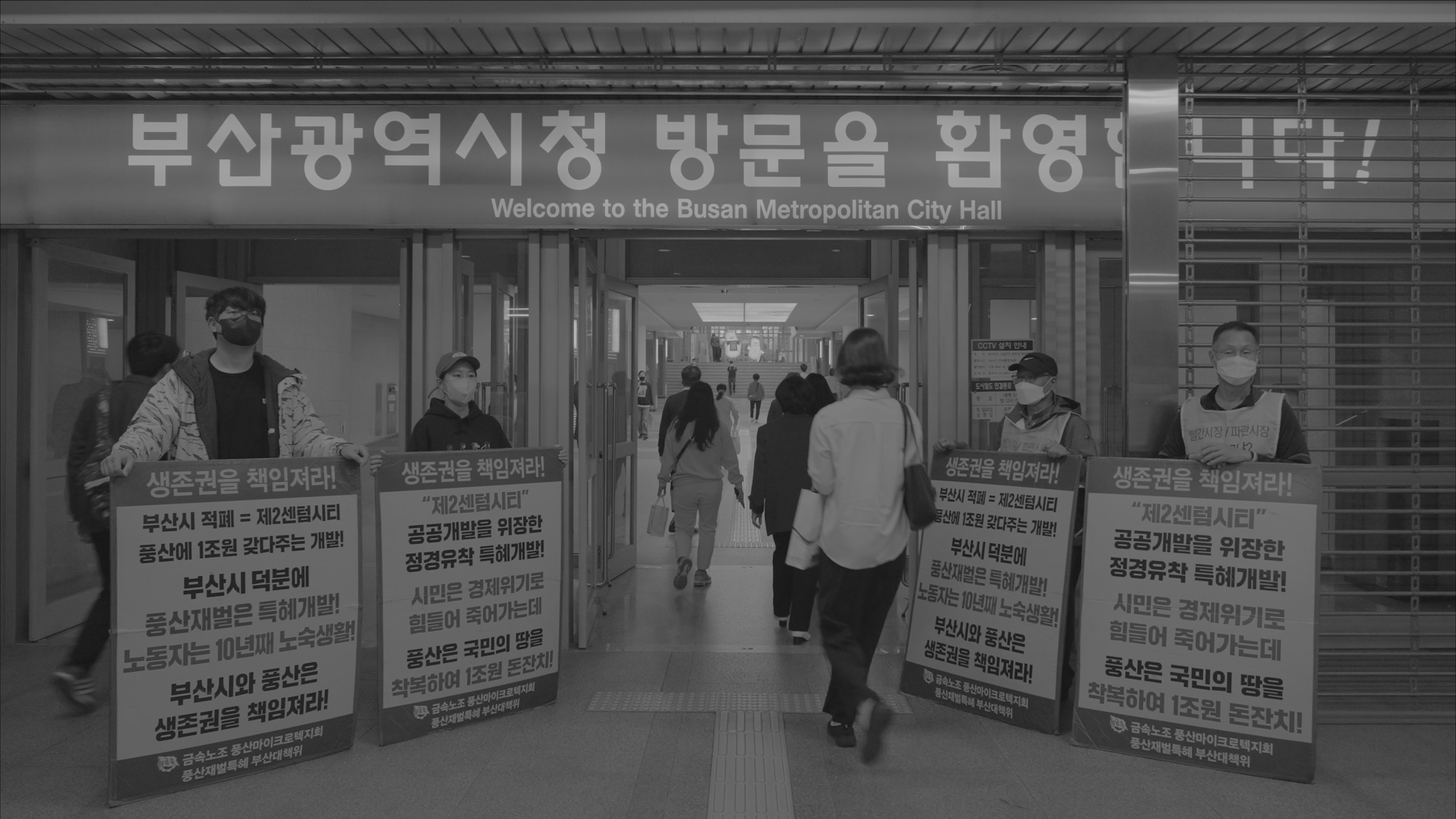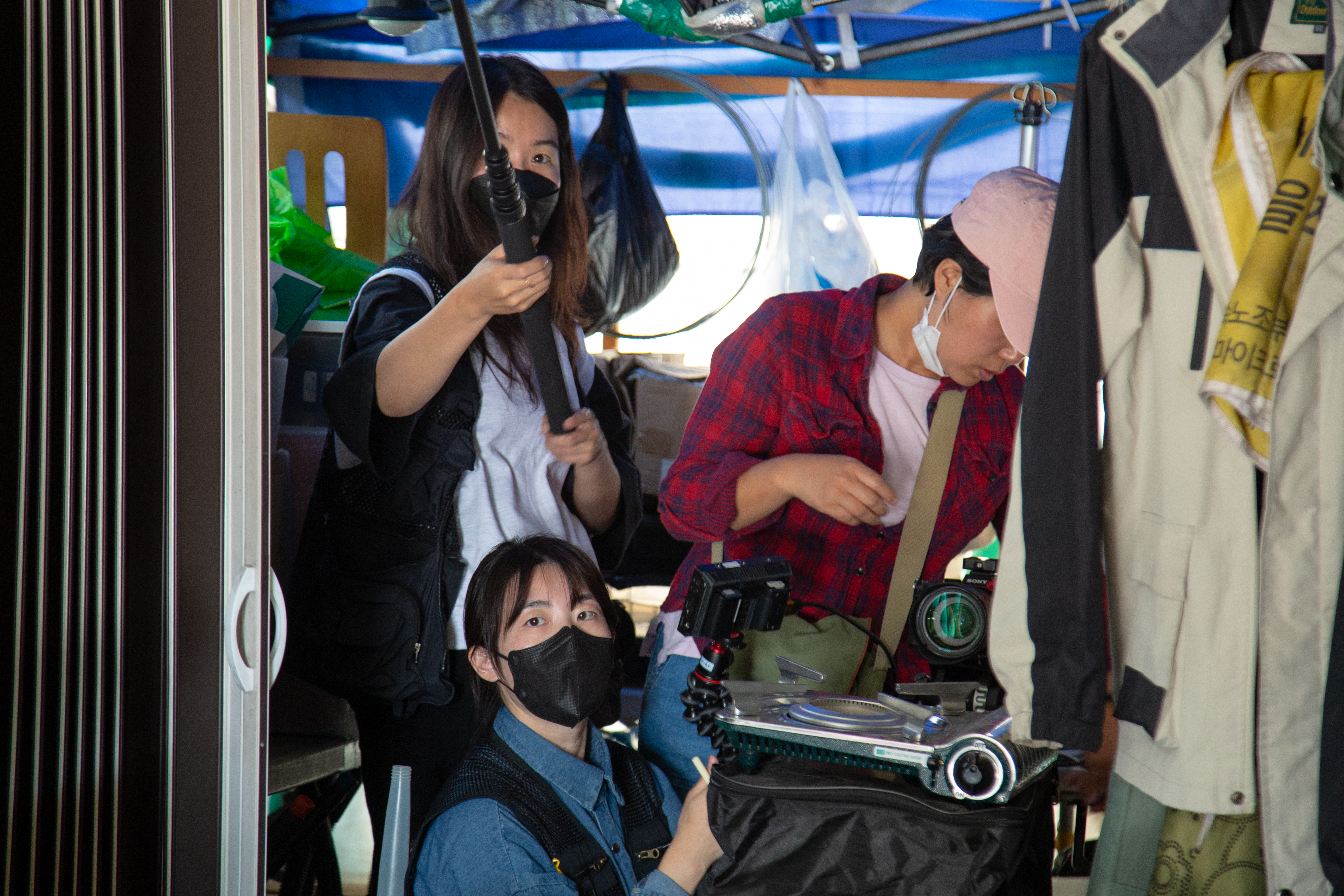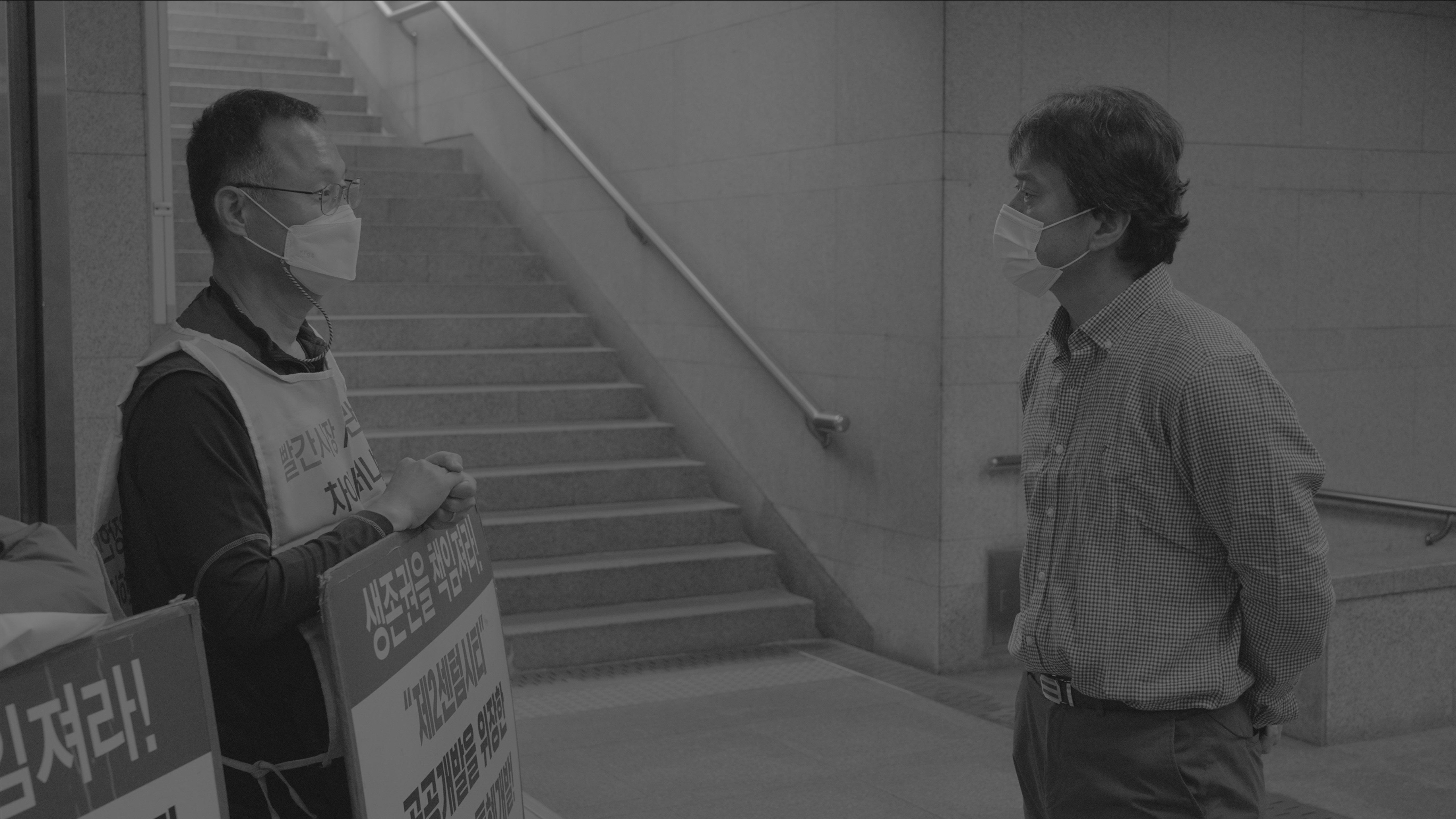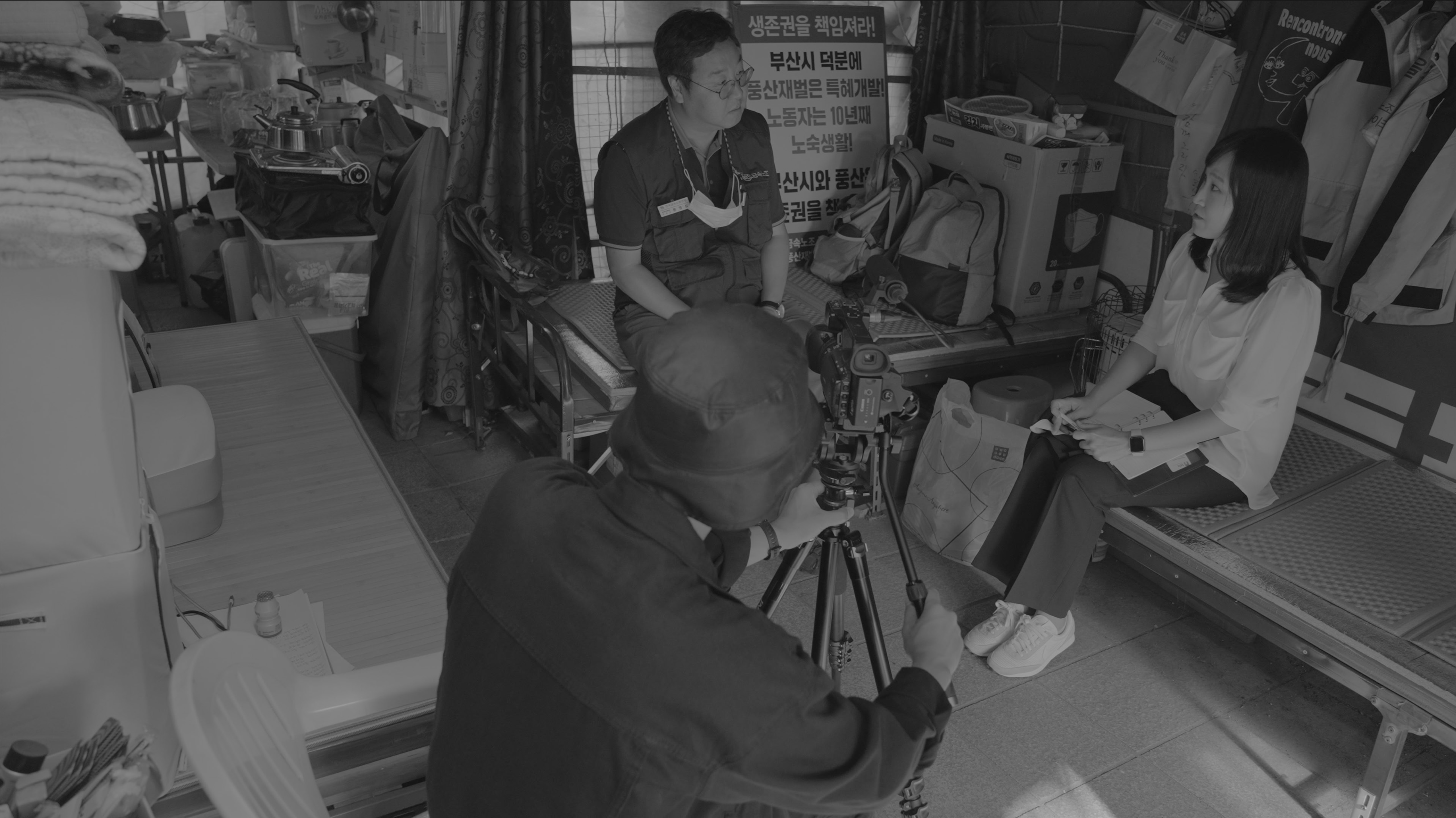 연출자로서 실제이지만 실제가 아닌 상황을 관객이 인식하기를 원했고, 이를 위해 현재시점을 흑백화면으로 과거시점을 컬러화면으로 설정했습니다. 영상이 현재의 이야기를 하고 있지만 관객이 픽션임을 인식하여 실제 현실은 훨씬 녹록지 않음을 알아주었으면 했고, 희미한 과거를 이야기하지만 그들의 투쟁 기억은 여전히 생생하게 남아있음을 보여주고자 했습니다.