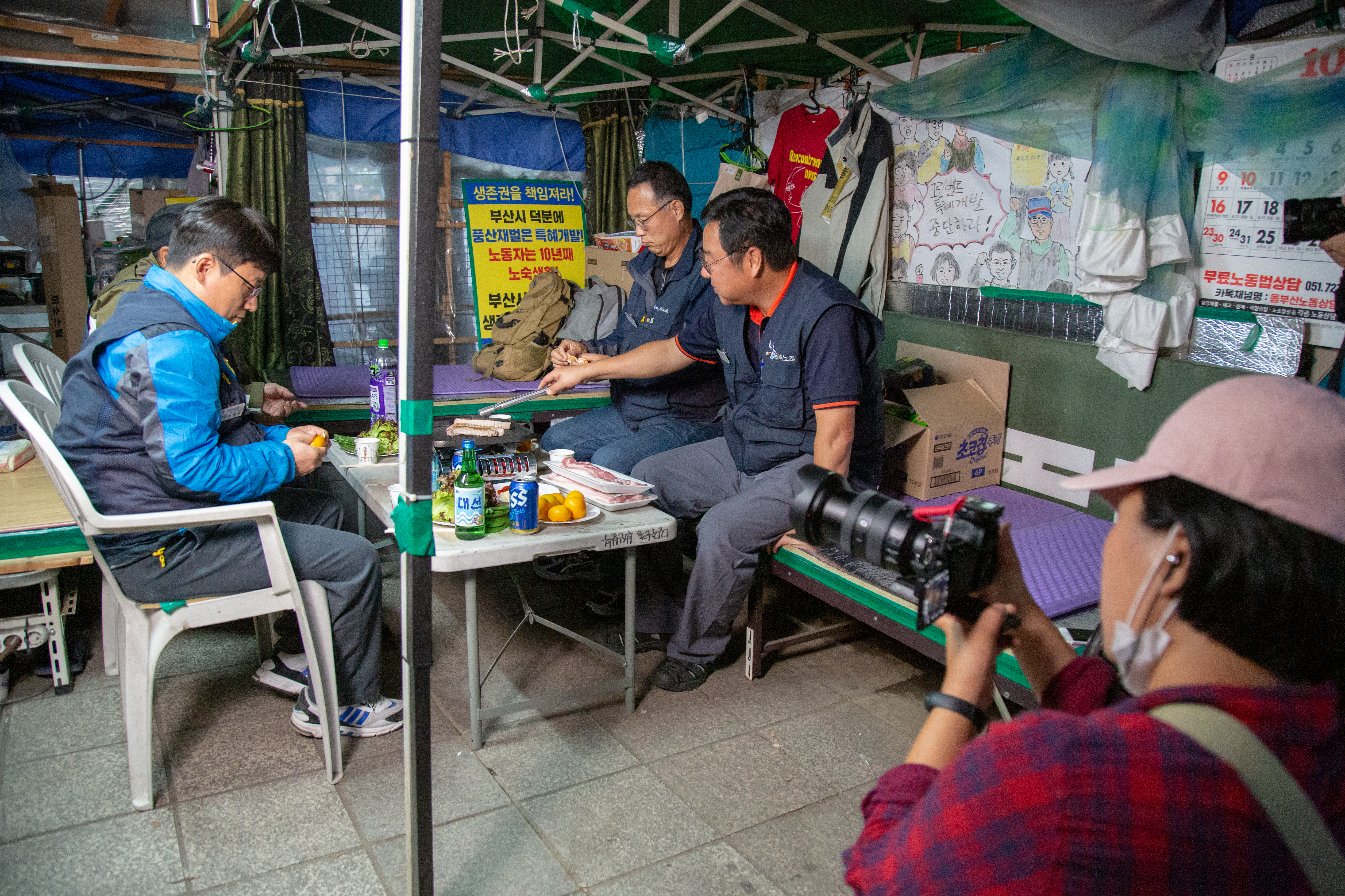이야기는 부산시청 앞 천막농성장을 중심으로 돌아가는 조합원들의 하루일과로 시작합니다.