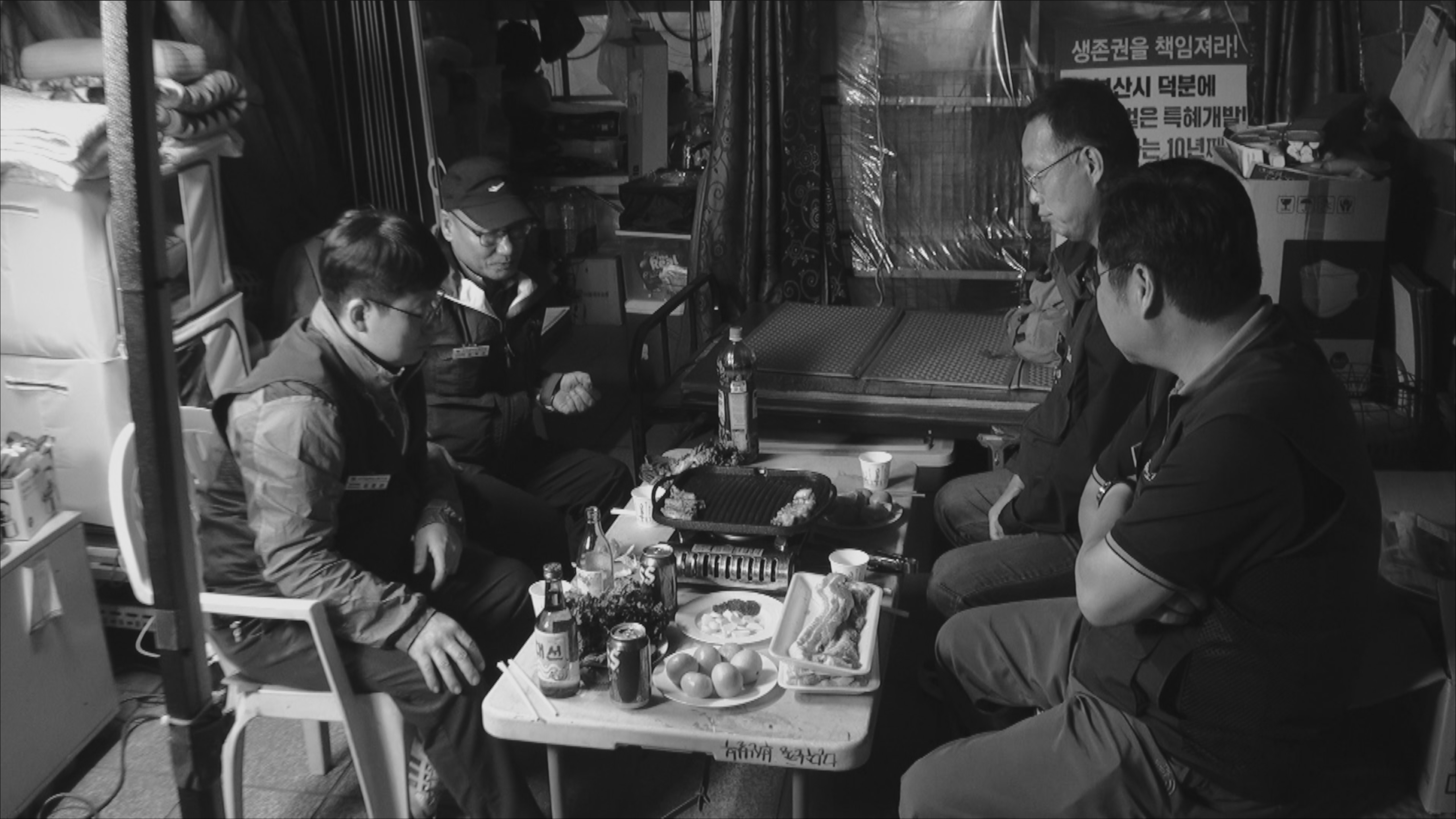<천막을 찾아오는 사람들>을 구성하는 세 가지 이야기 중 가장 핵심은 네 명의 조합원이 둘러앉아 12년간 투쟁의 소회를 나누는 마지막 시퀀스라고 생각합니다. 우리가 왜 싸웠는지, 투쟁에서 남기고 싶은 게 무엇인지, 어떤 것으로도 내려가지 않는 가슴 속 응어리는 무엇인지.