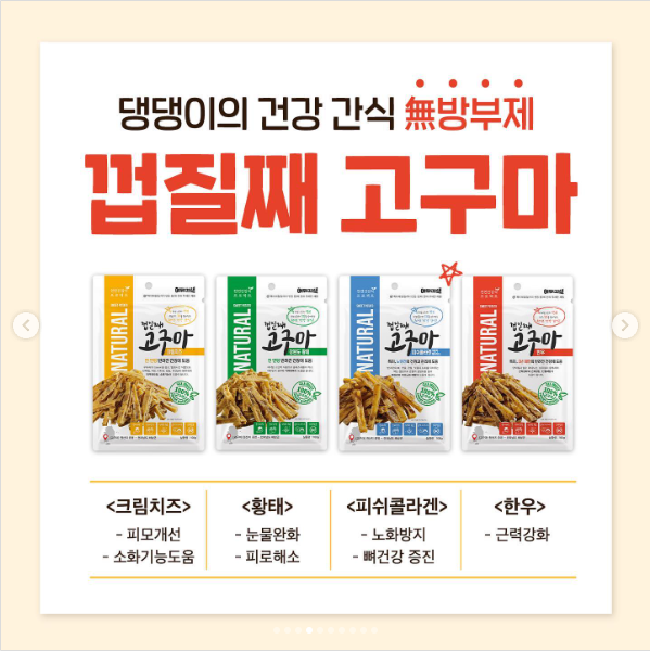 국산이 아닌 수입산인 경우 가장 문제되는 점이 방부제 첨가가 문제입니다. 앤즈글로벌에서 생산하는 천연수제 간식은 국산 고구마를 기본으로 하여 한우, 황태, 크림치즈, 피쉬콜라겐 4가지 재료를 더해 만들어졌는데요. 물론 이 간식은 방부제가 전혀 들어가지 않습니다. 여유견생 간식의 재료는 안전하고 건강에 좋은 재료로 만들어져 있으며, 특허받은 건조 기술로 만든 말랭이는 턱근육 발달과 스트레스 해소에 도움이 됩니다.