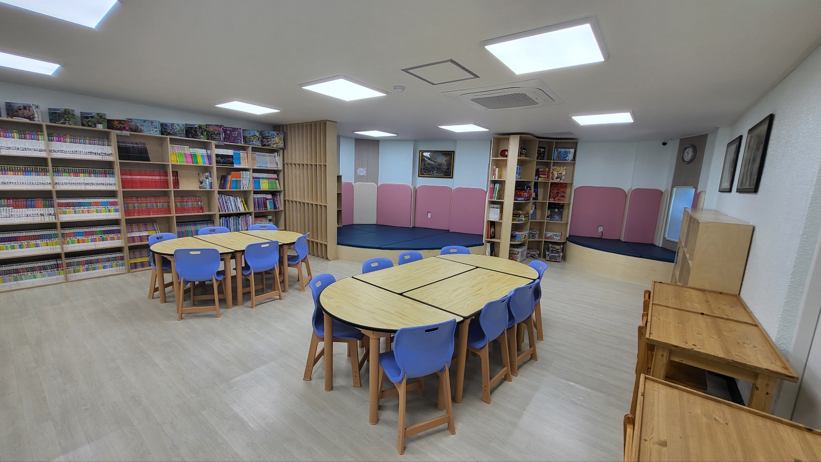그리고 이제 작은 도서관 안에서는 조금 정적인 놀이를 하거나 레고 활동을 하거나 책 읽기를 하거나 친구들하고 그림을 그리거나 블럭놀이 이런 것들은 이제 도서관 안에서 다 이루어집니다.