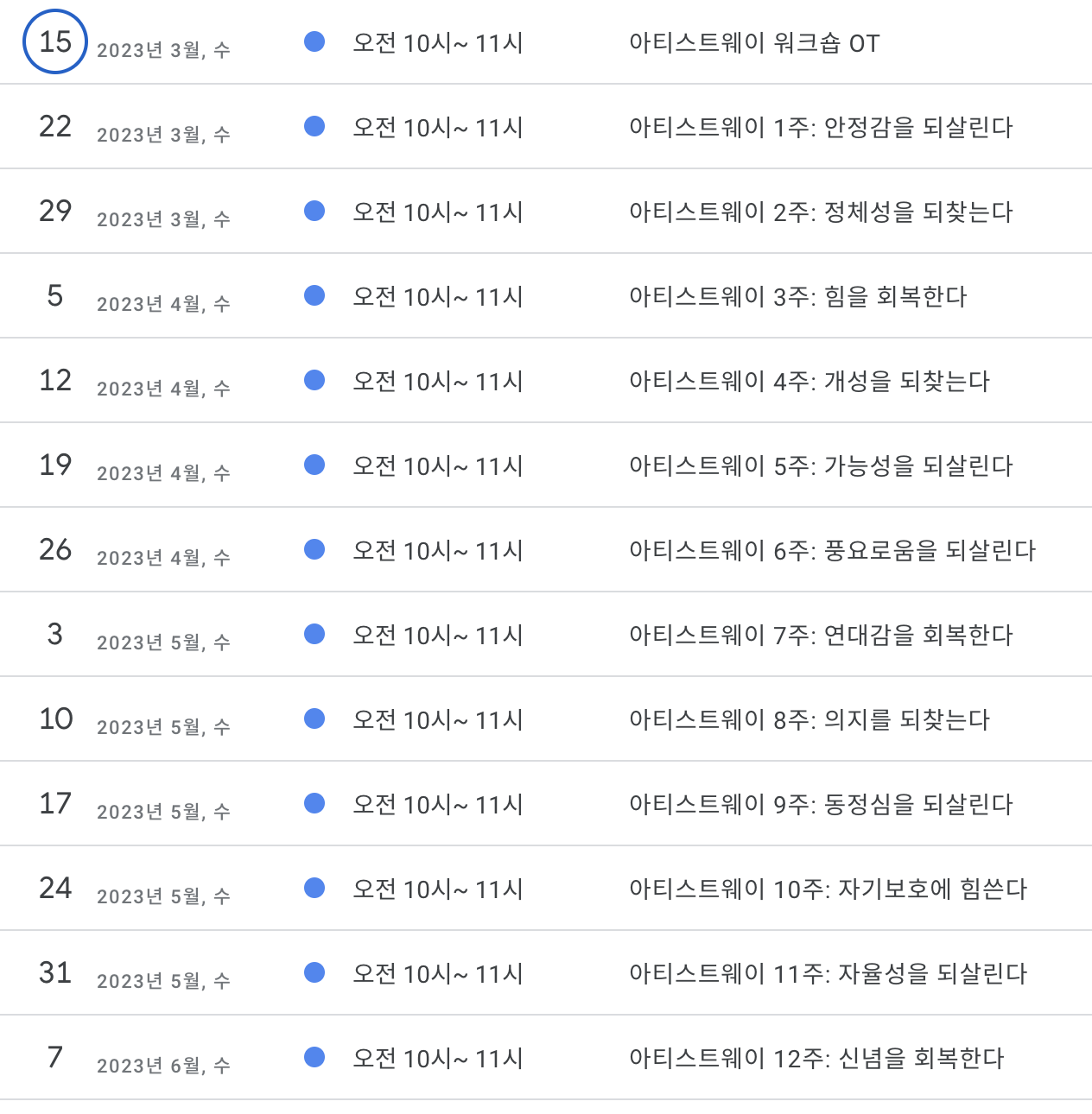 예전부터 아티스트웨이 워크숍은 알고 있던 터였다. 이웃 단체나 커뮤니티에서 워크숍을 한번식 열기도 하고 SNS에서도 유료 워크숍 홍보글로도 꽤 접했었다. 그러나 3개월 가까이 짜여진 스케쥴에 맞춰 모임에 꾸준히 나가는 것이 부담스럽고 결석이 잦아지면 모임에 방해가 될것 같기도 해서 거의 엄두를 내지 못했다. 그러나 미디토리 조합원들과 함께라면?! 시도해볼만하다는 생각이 들었다. 활동 스케쥴 전체를 공유하고 있고, 한두시간 정도의 모임 일정 조율은 얼마든지 가능하니까! 필요에 따라서는 온라인모임에 대한 합의도 빨리 이루어질수 있으니 말이다. 그렇게 시작된 아티스트웨이는 12주동안 세번의 온라인 모임과 아홉번의 만남을 가졌다.