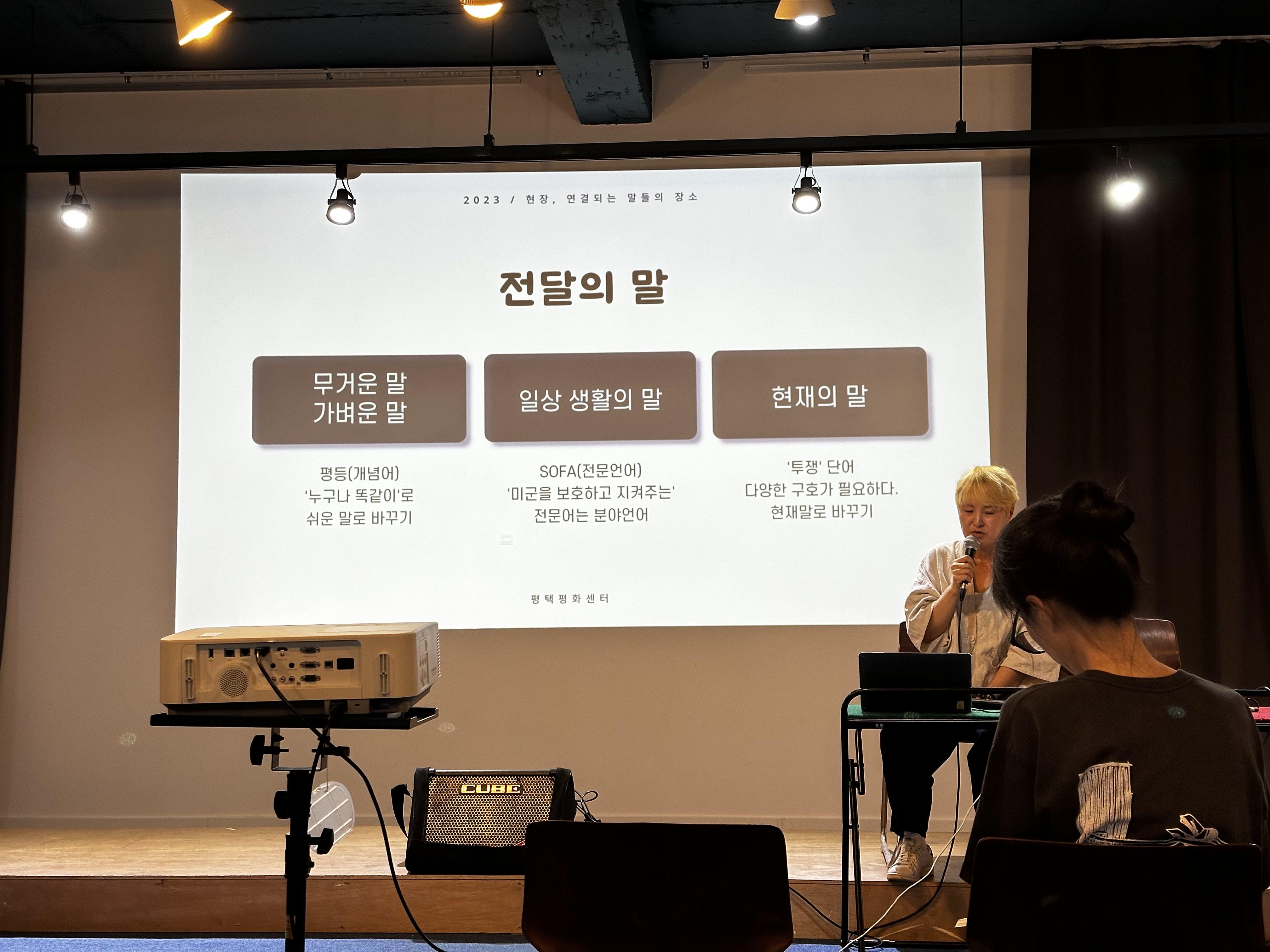 '현장, 연결되는 말들의 장소' 를 주제로 '사회운동, 활동의 현장’에서 진행되는 기록과 전달의 ‘말’이 어떤 역할을 하고 있는지, 어떤 역할을 하길 바라는지에 관해 이야기 나누는 자리를 마련해주셨습니다. 1)오키나와 헤노코 2) 제주 강정 3)군산 4)평택 미군기지의 평화활동가들이 한자리에 모이셨어요.