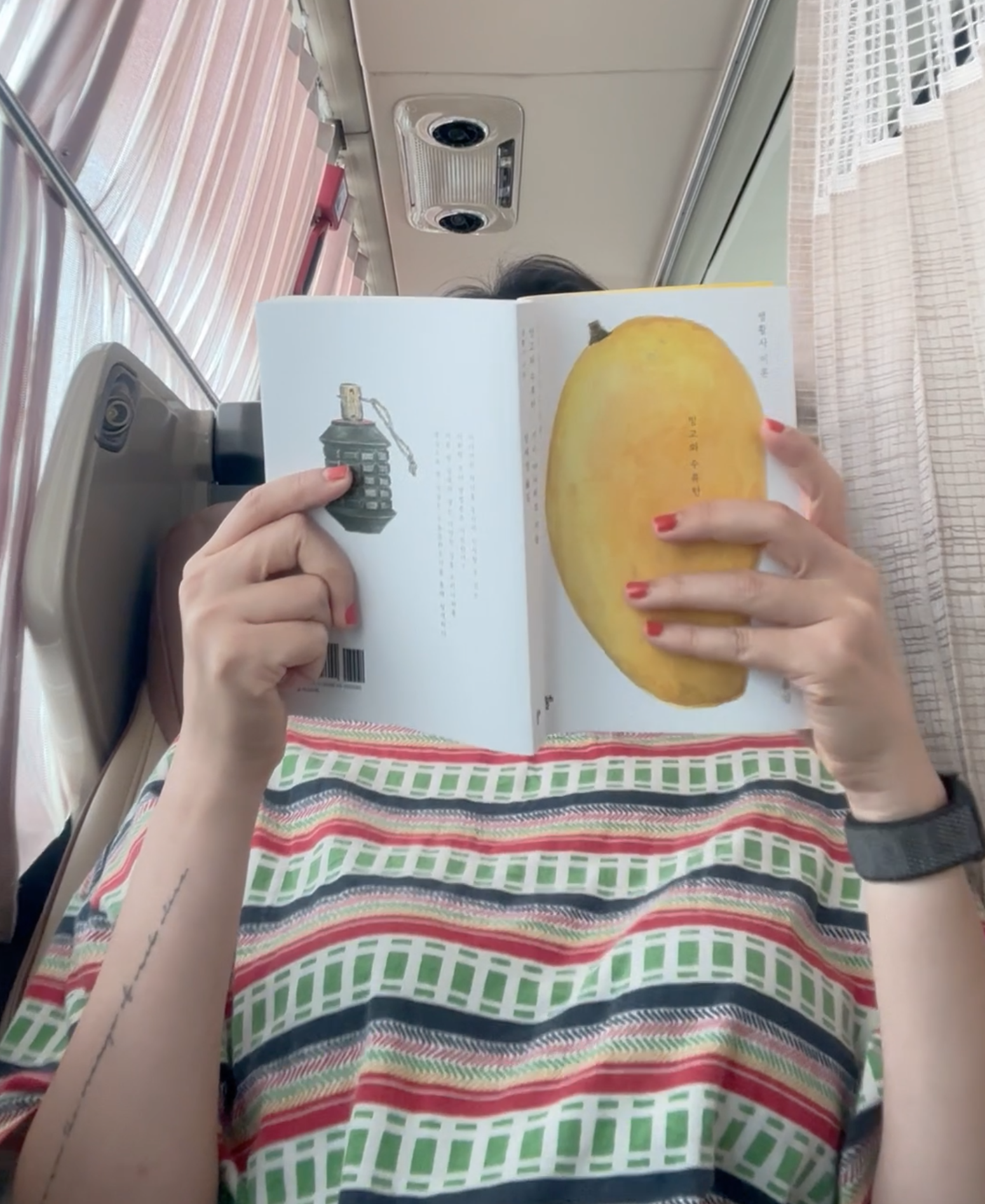 긴 호흡으로 하루하루 미군이 자리한 땅과 사람들을 기록하며 싸우는 평화운동가들의 이야기를 듣기위해 꼭두새벽부터 청주행 버스에 탑승했습니다! 이날 저와 동행한 책친구는 공룡의 혜린님이 추천해주신 <망고와 수류탄>이라는 책입니다. 오키나와 주민들의 구술기록작업을 하신 사회학자의 에세이같은 논문, 논문같은 에세이라고나 할까요?