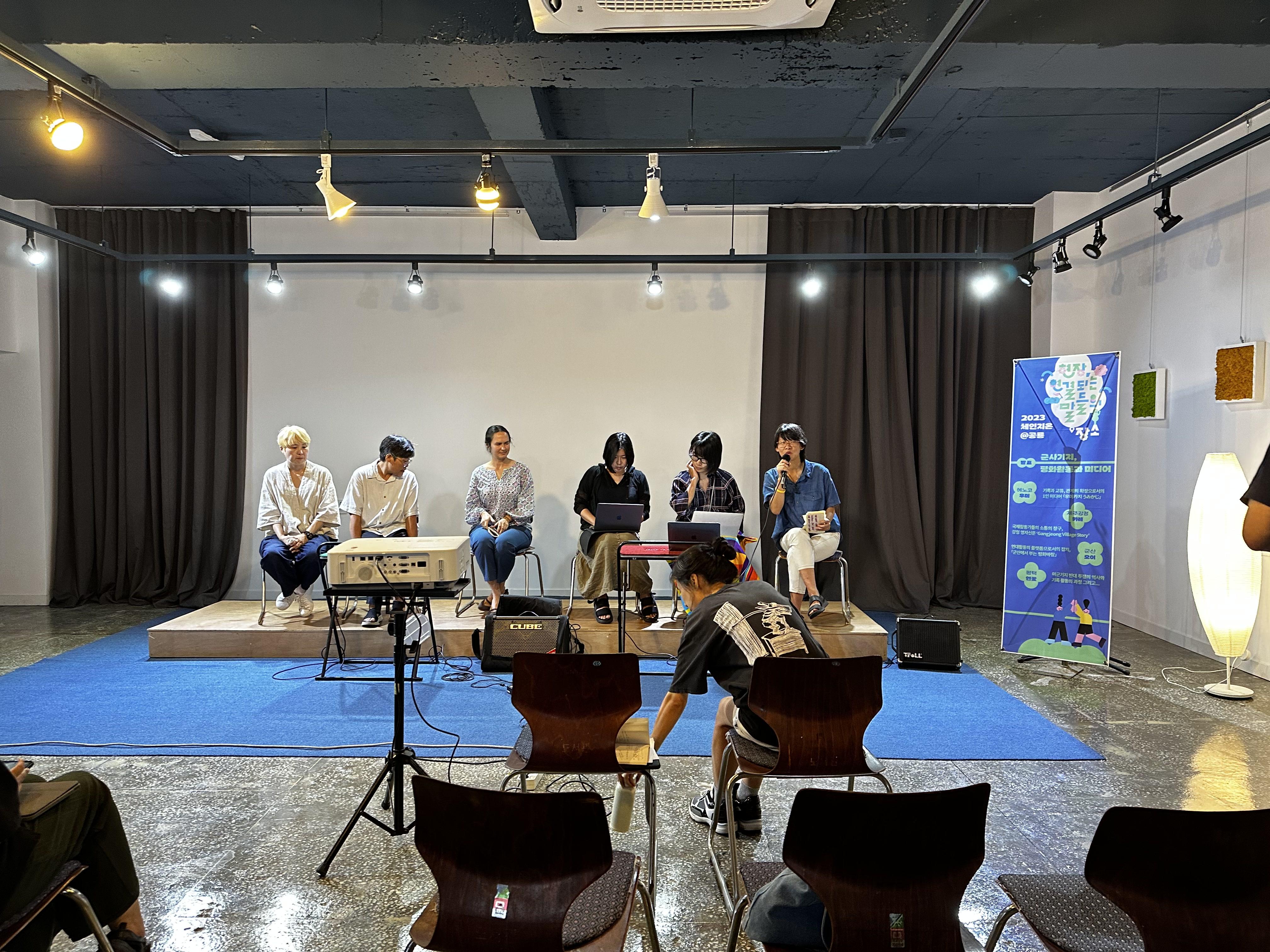 드디어 청주도착! '스페이스 타고'라는 공간은 청주 지역예술인들이 다양한 활동을 하는 공간인데요. 올해 공룡의 파트너단체로서 이 공간을 내어주셨다고 해요. 소담한 무대와 아기자기한 조명이 있는 공간이 참 잘 어울렸어요. 올해 체인지온@공룡을 기획한 혜린님의 따뜻한 환영인사와 함께 체인지온@공룡의 문이 활짝 열렸어요.