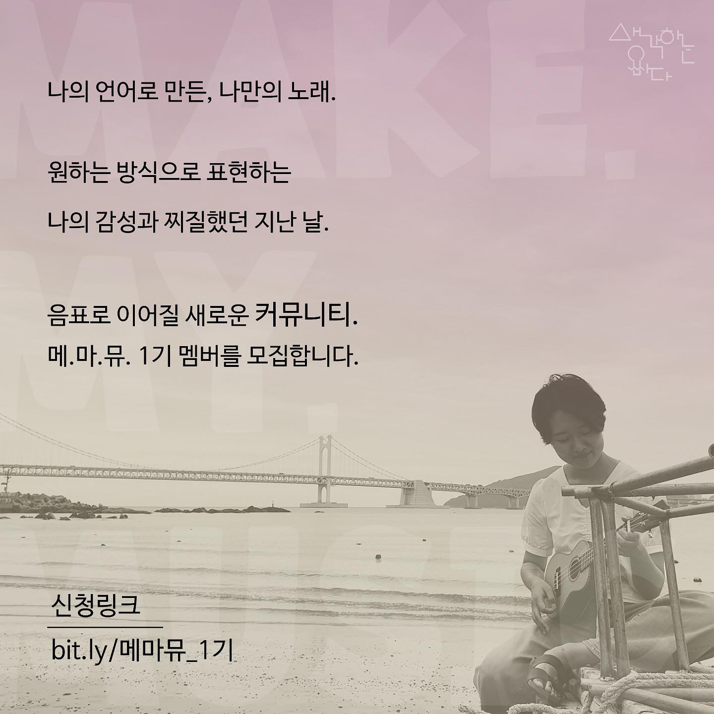 그래서 부산에 내려와서 '메마뮤'라는 프로그램을 만들게 되었어요. 메마뮤는 메이크 마이 뮤직(Make my music)의 줄임말인데 음악 초보자들에게 음악 만느는 걸 가르쳐 주고, 완성된 곡을 무대에 올리는 프로그램이에요.