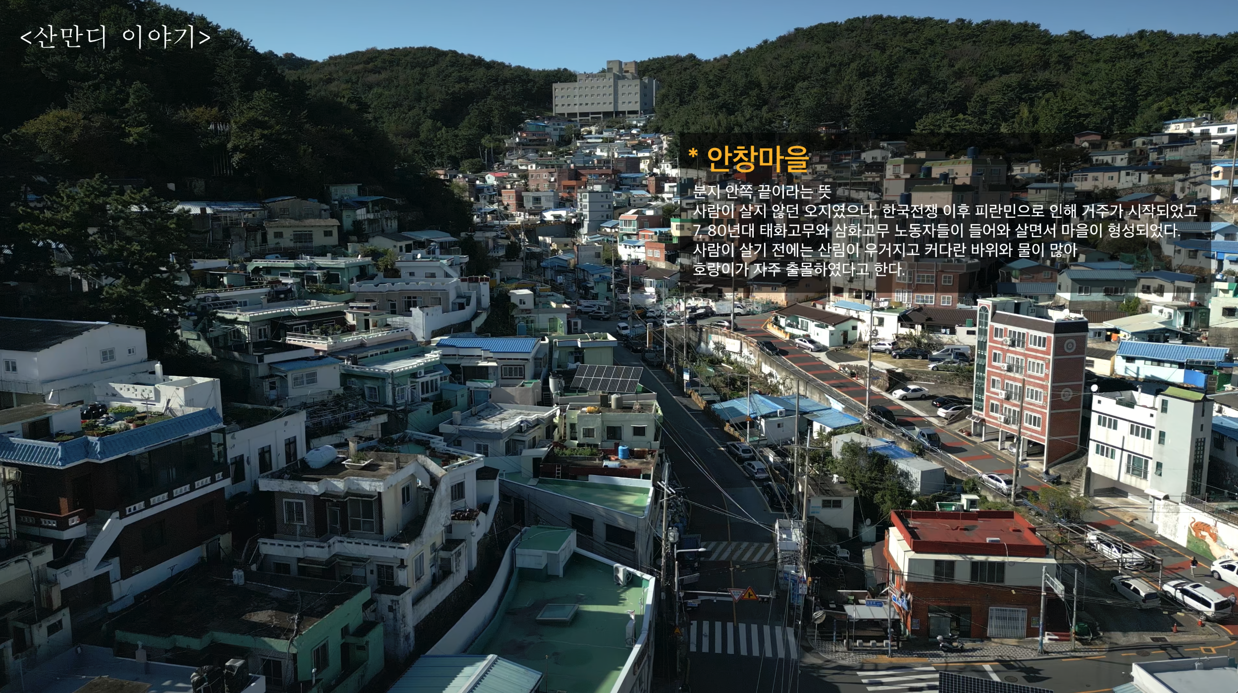 “안창마을 들어가는 입구 쪽에서 좌천동 성북시장 있는 일대로해서 쭉 이렇게 서면 저 멀리로 해서 둘러보면은 6,70년대 주거 흔적들 7,80년대 주거 흔적들 그리고 이제 8,90년대 그리고 2000년대 부산의 도시 변화상들을 쭉 볼 수가 있는데요. 부산의 산복도로라 그러면 거의 부산을 상징하는 도로다 해도 과언은 아닙니다. 세계적으로도 그렇고, 우리나라에서도 이렇게 산자락에 도로가 대중교통이나 도로가 있는 도시가 별로 없죠.” (김한근 / 부경근대사료연구소 소장 인터뷰 중)