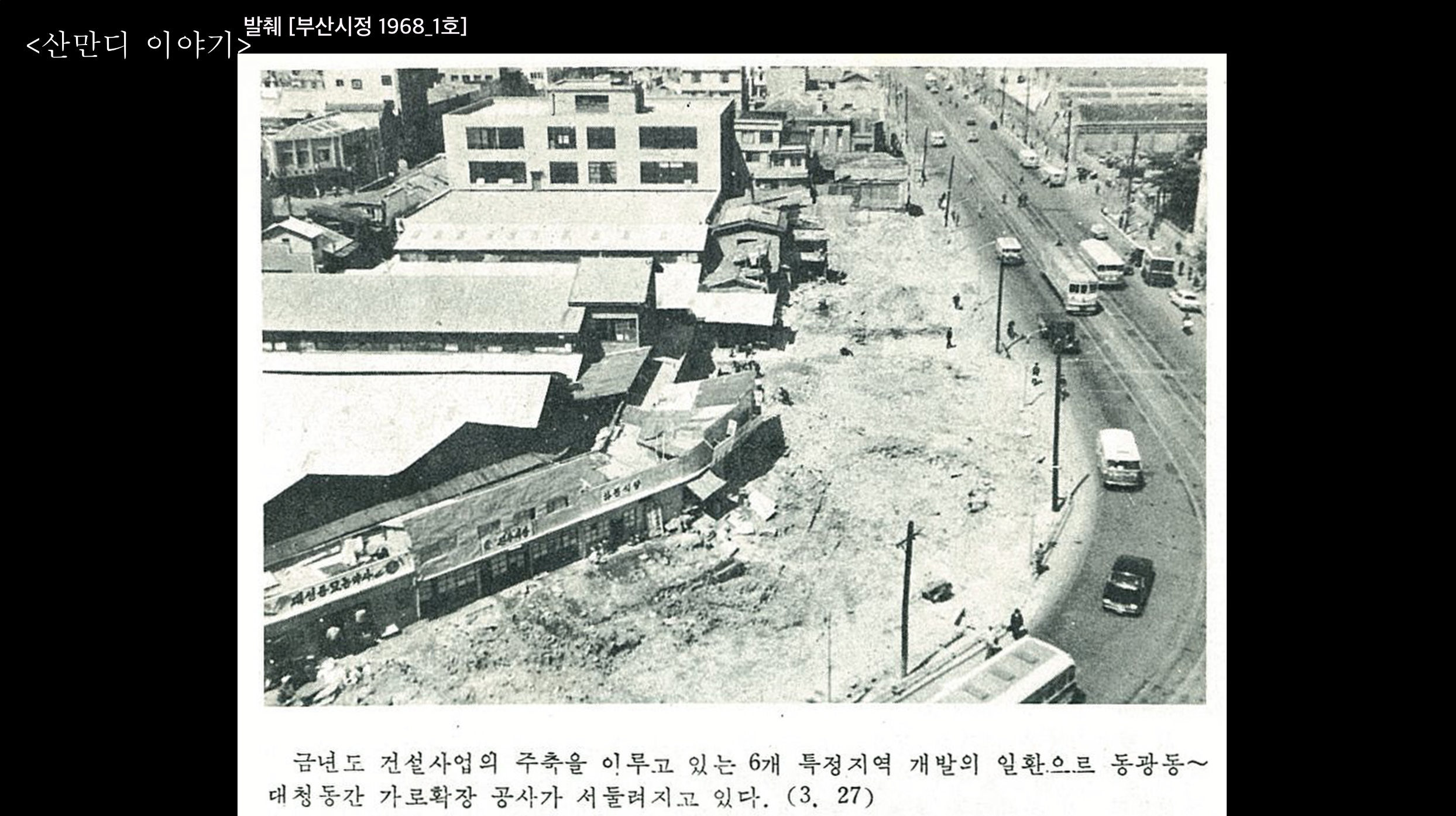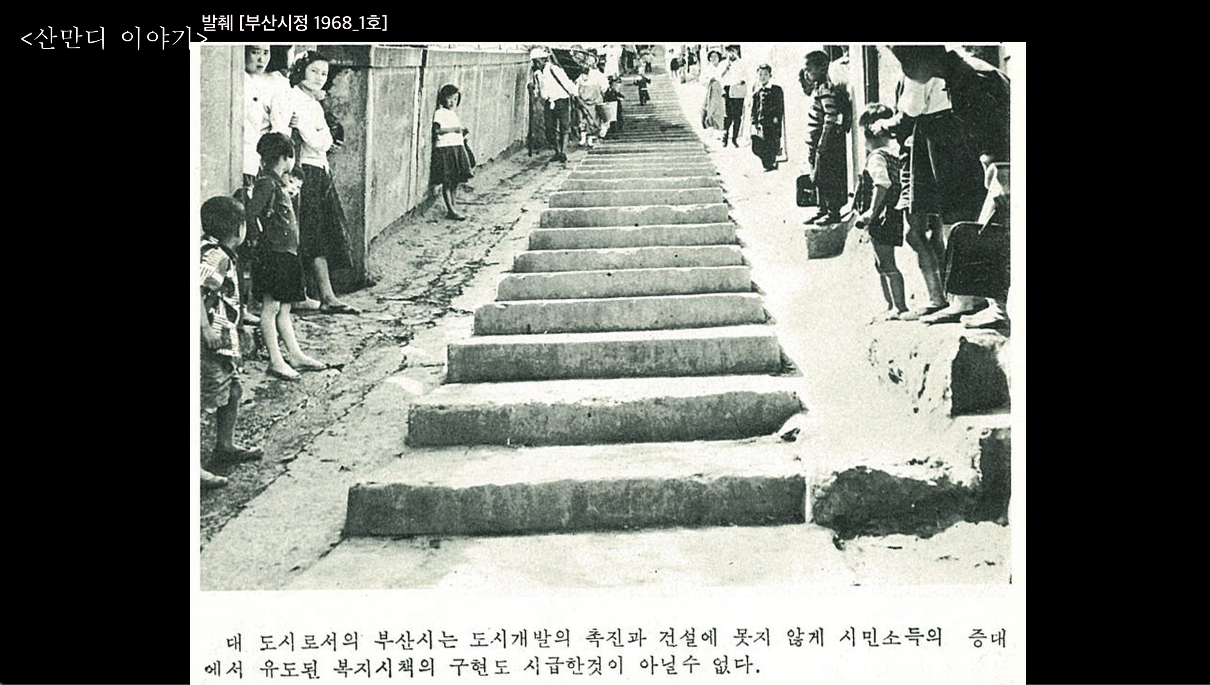 “주민들을 위해서 산복도로를 만들기 시작하는 것은 1960년대 초반부터 출발하죠. 초기의 산복도로 계획은 현재 범곡 교차로라 일반인들은 교통부 로타리라 불리는 곳이죠. 거기에서 안창마을 쪽으로 올라가는 길을 따라가다가 성북시장으로 해서 좌천동 그리고 수정동 초량으로 이어지는 지금 현재 금수사 앞자락 바로 밑에 과거에 초량 목장이라는 곳이 있었습니다. 지금은 연립주택단지가 되었는데 거기까지 하는 것이 맨 처음 시작되고, 그 다음에 거기서부터 시작해서 지금 산복도로 전시관이 있는 초량쪽을 거쳐서 그리고 민주공원 옆쪽에 영주 삼거리로 해서 메리놀 병원까지 가는 이 단계가 두 번째 단계로 이렇게 지금 추정이 되고요. 그 다음에는 70년대에 들어서서는 민주공원 아래에서 보수동을 거쳐 가지고 대신동으로 연결하는 망양로가 또 만들어지는 이런 건설들이 생겨나는 거죠.” (김한근 / 부경근대사료연구소 소장 인터뷰 중)