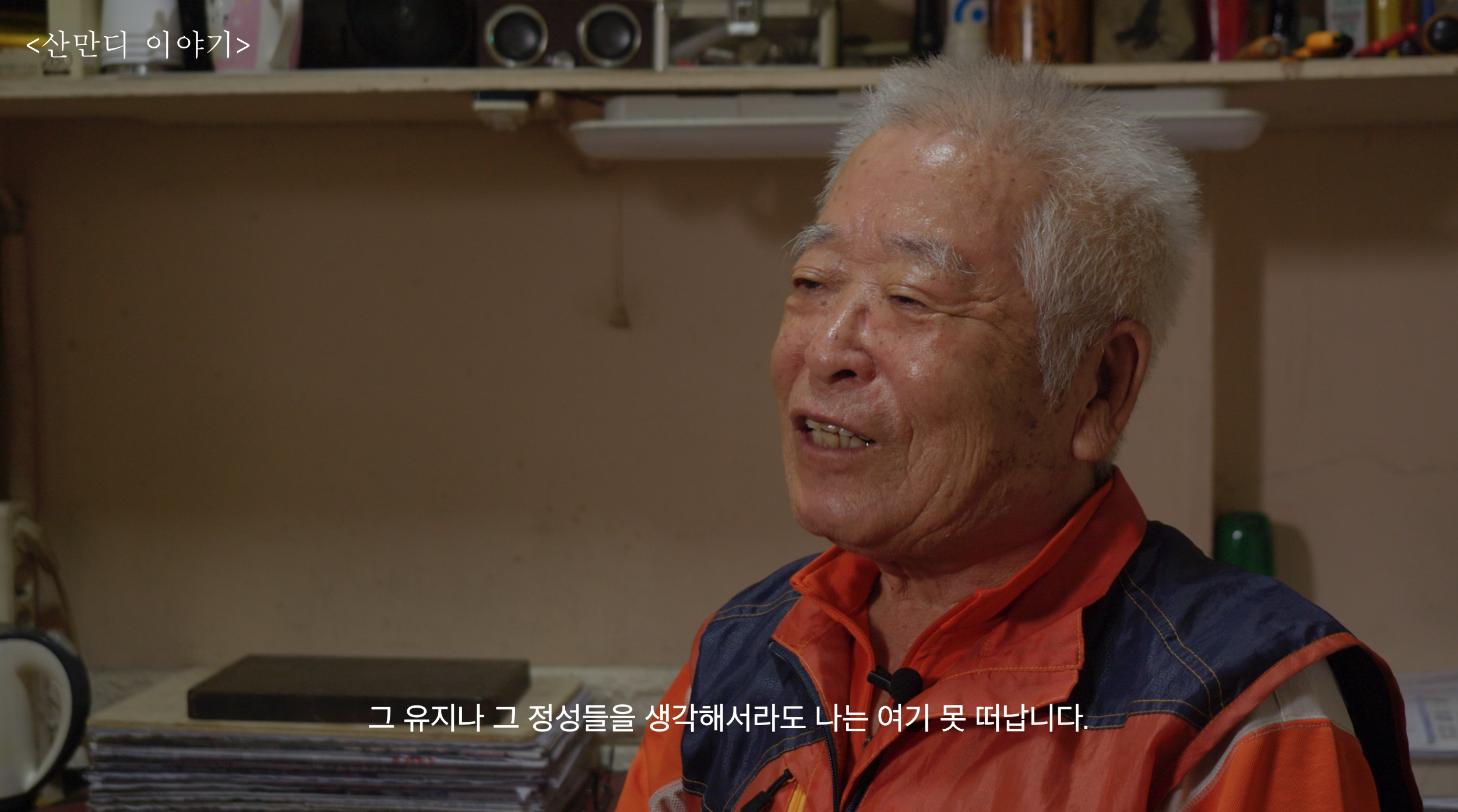 “여기서 나는 생을 마감 할라고 마음먹고 있습니다. 어머니, 아버지, 할머니, 내가 조모님 밑에서 살았기 때문에 그 유지나 그 정성들을 생각해서라도, 나는 여기를 못 떠납니다. 거의 얘기를 하자면은 여기서 같이 자라고, 같이 살던 사람들도 외지에 나간 사람들이 다른 사람을 찾아와도 내가 여기 오래 있으니까 나한테 물어보고 찾습니다. 그러니까 거의 뭐 백과사전이나 한 가지죠.” ( 조진시 / 마을주민 인터뷰 중)