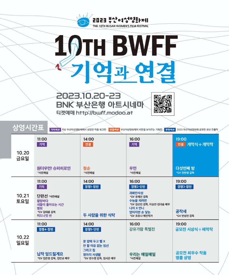 김/ 올해 부산여성영화제는 10월 20일부터 22일까지 3일간 남포동 BNK 부산은행 아트시네마 모퉁이 극장에서 열립니다. 부산여성영화제는 2009년에 시작해서 몇 차례 2년에 한번 비엔날레 방식으로 열어 시작한 지는 10년이 넘었지만 올해로 10회를 맞았습니다. 부산 지역에서는 어린이, 평화, 반핵, 국제영화제 등 다양한 영화제가 열리고 있는데요. 7회 영화제부터는 다시 매년 개최하게 되었으니 매년 가을에 열리는 부산여성영화는 여성주의 시각에서 성별 문제를 다루는 영화제는 부산여성영화제가 유일합니다.